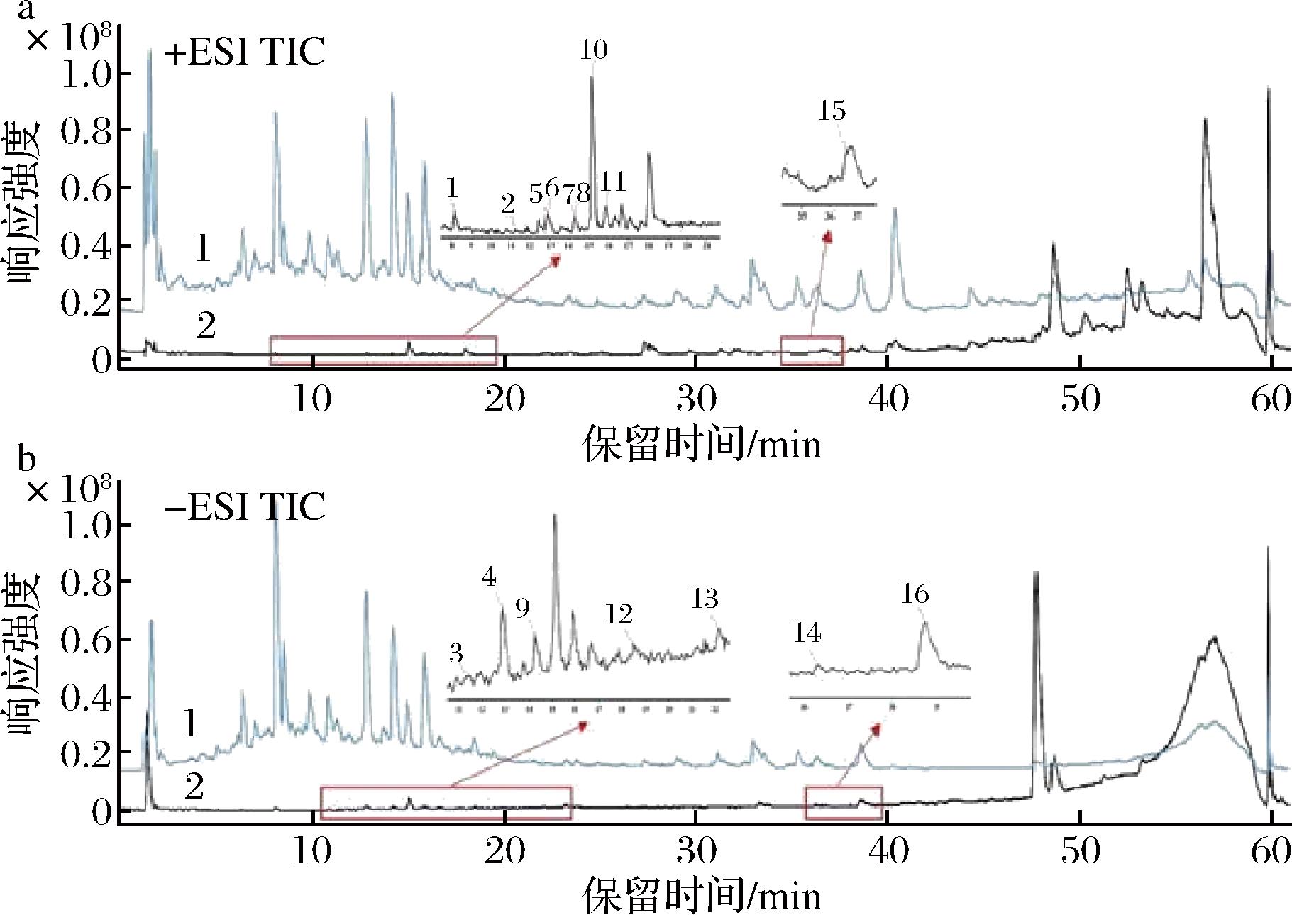 注:1为青钱柳提取物的总离子流图,2为固定化酶筛选活性成分。