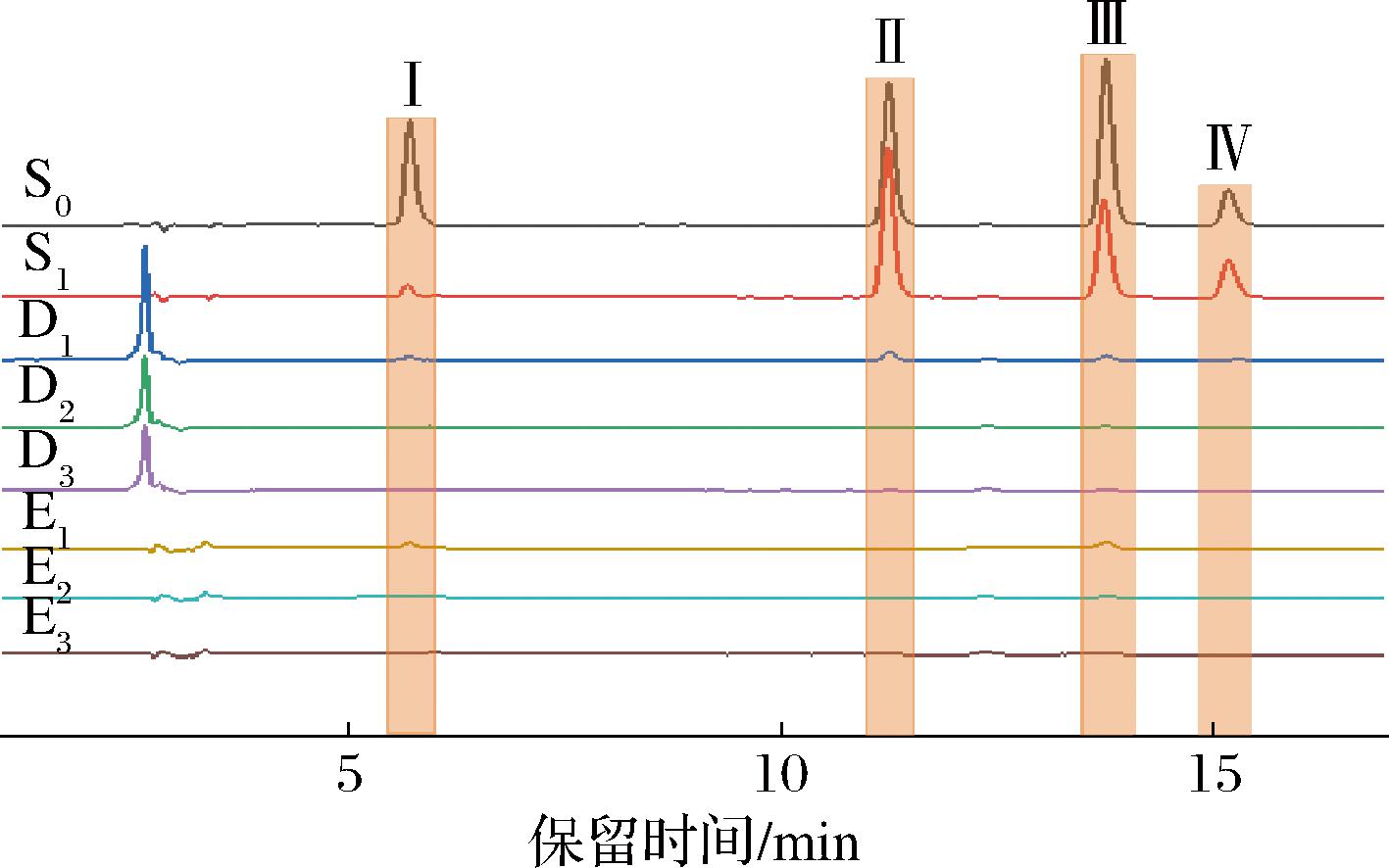采用磁分离固相萃取联用HPLC技术进行活性成分筛选。具体操作如下:取1.0 mL含4种标准品(S0)的混合溶液与5 mg Fe3O4-α-葡萄糖苷酶复合物于离心管中,37 ℃恒温振荡孵育30 min使酶-配体充分结合。采用磁分离法收集上清液(S1)后,依次进行三步净化处理:使用500 μL PB连续洗涤3次(D1~D3)以去除非特异性吸附杂质;采用90%乙腈水溶液(体积分数)洗脱3次(E1~E3)解离活性配体。所有组分(S0~E3)经0.22 μm微孔滤膜过滤后,采用Agilent 1260 HPLC系统进行分析。色谱条件:依利特Supersil ODS2 C18色谱柱(150 mm×4.6 mm,5 μm),流动相为0.1%甲酸水溶液(A)-乙腈(B),梯度洗脱程序(0~25 min,30%~70% B;25~27 min,70%~30% B;27~30 min,30% B),流速0.6 mL/min,柱温35 ℃,检测波长254 nm,进样量10 μL。