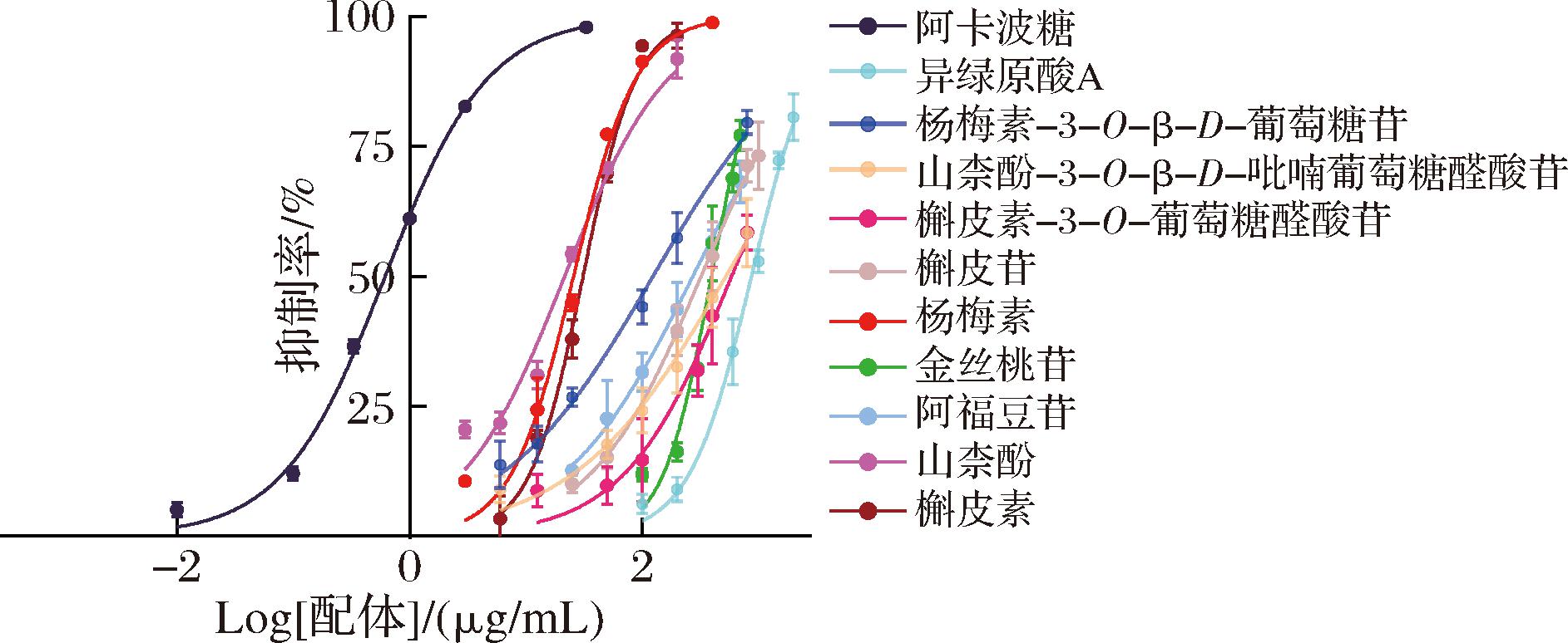 排除化合物1和13假阳性结果并对剩余成分进行体外活性验证。随着活性化合物浓度的增加,各化合物对α-葡萄糖苷酶的抑制活性逐渐增强,如图6所示,各活性化合物和阿卡波糖IC50值如下:异绿原酸A(870.3 μg/mL)、杨梅素-3-O-β-D-葡萄糖苷(123.9 μg/mL)、槲皮素-3-O-葡萄糖醛酸苷(587.2 μg/mL)、槲皮苷(320.9 μg/mL)、杨梅素(25.7 μg/mL)、金丝桃苷(394.1 μg/mL)、阿福豆苷(272.7 μg/mL)、山柰酚-3-O-β-D-吡喃葡萄糖醛酸苷(524.9 μg/mL)、山柰酚(21.6 μg/mL)、槲皮素(31.0 μg/mL)和阿卡波糖(0.62 μg/mL)。结果表明,10种活性成分对α-葡萄糖苷酶具有较强的抑制作用,但与阳性药物阿卡波糖相比效果较差。