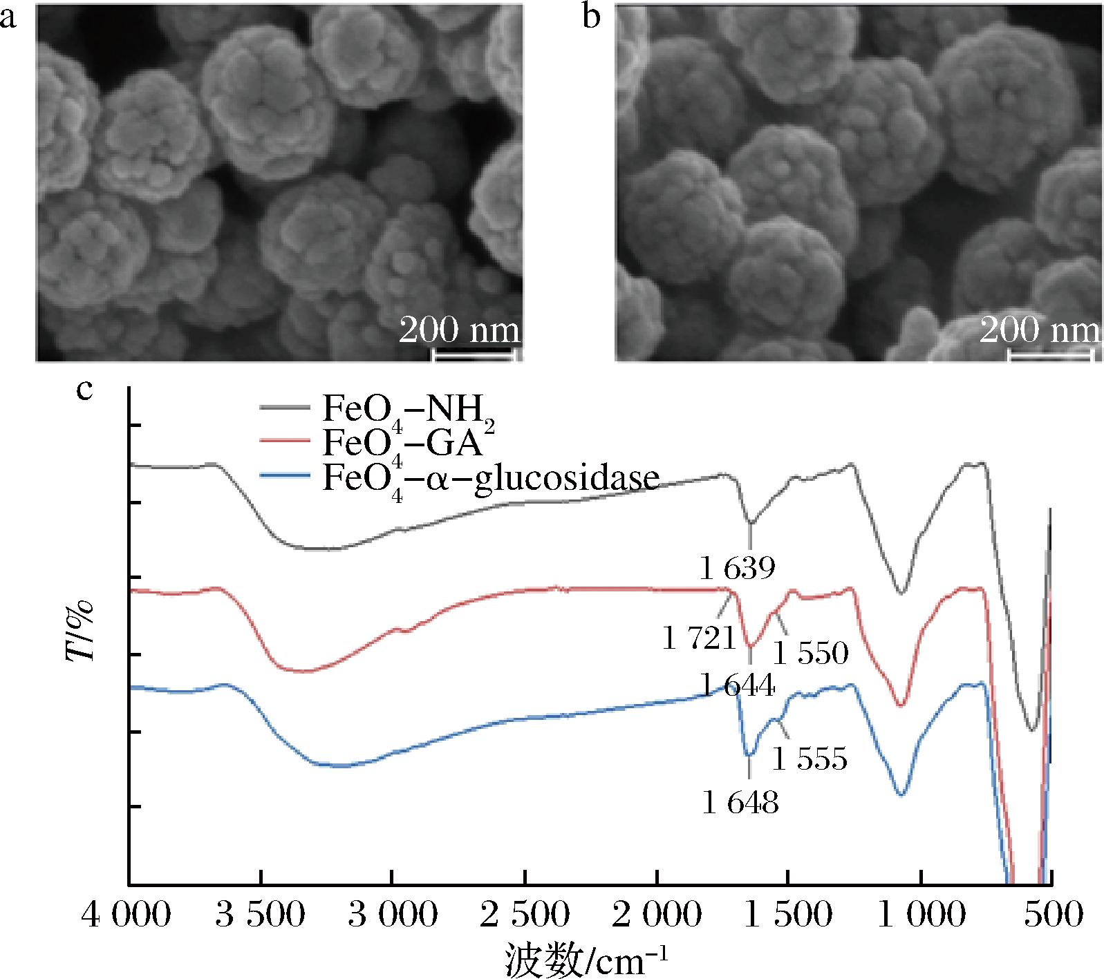 通过场发射扫描电子显微镜对Fe3O4-NH2和Fe3O4-α-葡萄糖苷酶的粒径和形貌进行比较。由图2-a和图2-b可以观察到Fe3O4-NH2与酶反应后,磁性微粒表面形貌显著改善,呈现更为光滑的表征,且平均粒径略有增加,表现出良好的分散性。傅里叶变换红外光谱结果如图2-c所示,表明Fe3O4-NH2经戊二醛修饰和固定化α-葡萄糖苷酶后,Fe3O4-NH2在1 639 cm-1(δN—H)处的吸收峰移至1 644 cm-1和1 648 cm-1。Fe3O4-GA在1 721 cm-1和1 550 cm-1处的吸收峰分别是由C