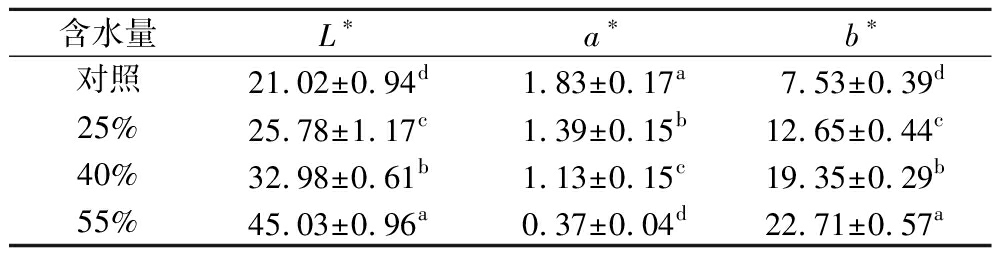 含水量L∗a∗b∗对照21.02±0.94d1.83±0.17a7.53±0.39d25%25.78±1.17c1.39±0.15b12.65±0.44c40%32.98±0.61b1.13±0.15c19.35±0.29b55%45.03±0.96a0.37±0.04d22.71±0.57a