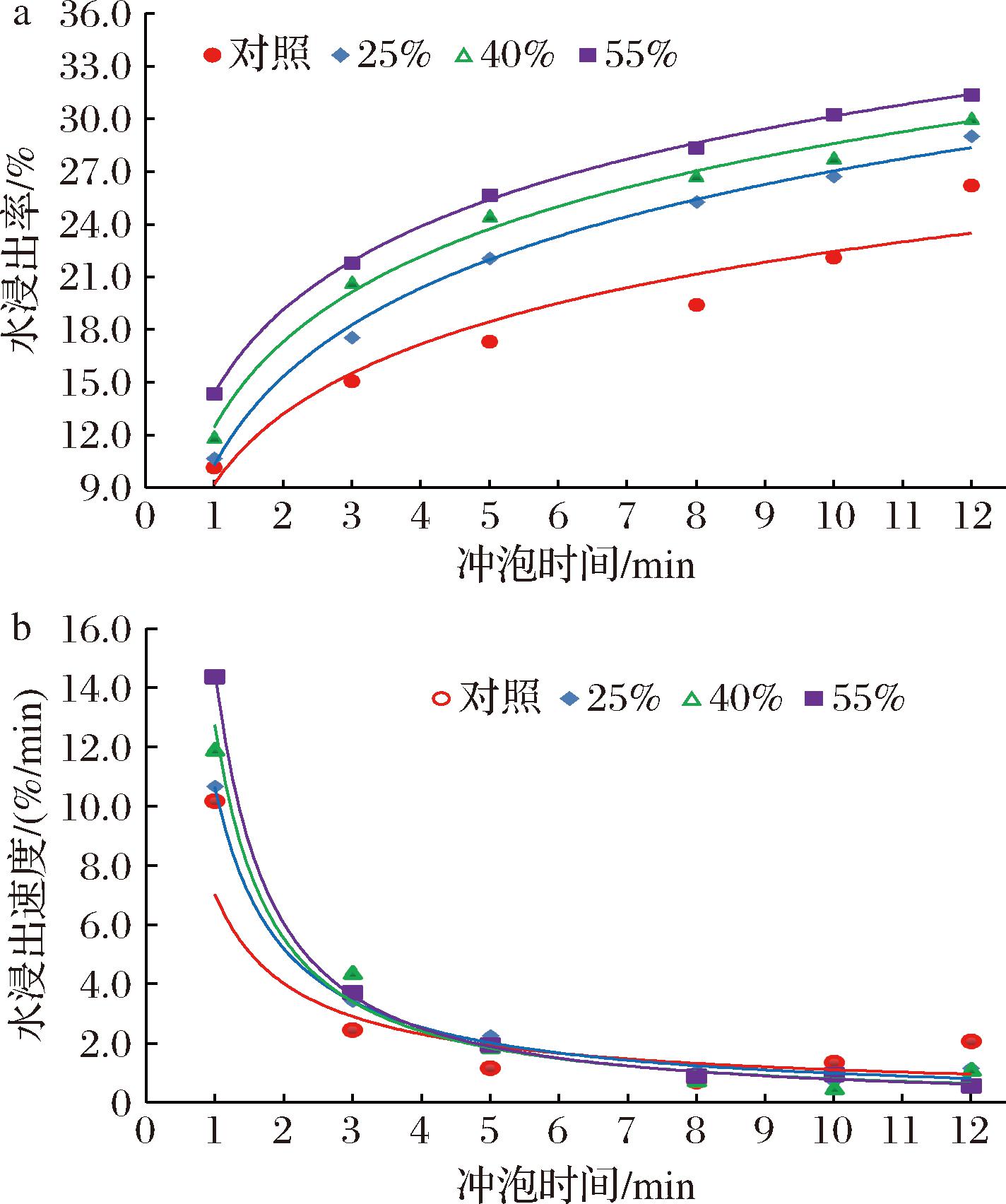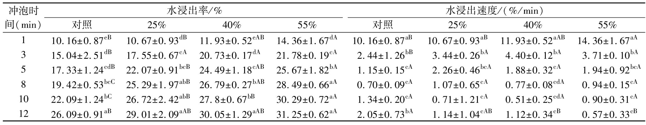 冲泡时间(min)水浸出率/%水浸出速度/(%/min)对照25%40%55%对照25%40%55%110.16±0.87eB10.67±0.93dB11.93±0.52eAB14.36±1.67dA10.16±0.87aB10.67±0.93aB11.93±0.52aAB14.36±1.67aA315.04±2.51dB17.55±0.67cA20.73±0.17dA21.78±0.19cA2.44±1.26bB3.44±0.26bA4.40±0.12bA3.71±0.10bA517.33±1.24cdB22.07±0.91bcB24.49±1.18cAB25.67±1.82bA1.15±0.15cA2.26±0.46bcA1.88±0.32cA1.94±0.92bcA819.42±0.53bcC25.29±1.97abB26.79±0.27bAB28.49±0.66aA0.70±0.09cA1.07±0.65cA0.77±0.08cdA0.94±0.15cA1022.09±1.24bC26.72±2.42abB27.8±0.67bB30.29±0.72aA1.34±0.20cA0.71±1.21cA0.51±0.25cdA0.90±0.31cA1226.09±0.91aB29.01±2.09aAB30.05±1.29aAB31.25±0.62aA2.05±0.73bA1.14±1.04cAB1.12±0.34cB0.57±0.33cB