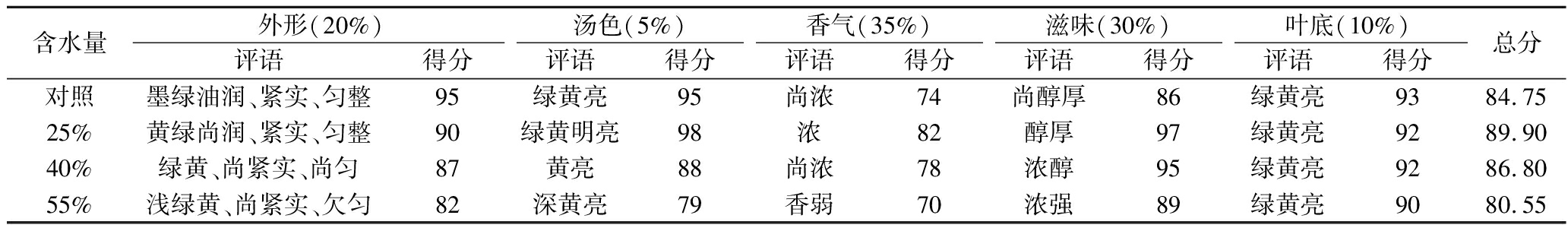 含水量外形(20%)汤色(5%)香气(35%)滋味(30%)叶底(10%)评语得分评语得分评语得分评语得分评语得分总分对照墨绿油润、紧实、匀整95绿黄亮95尚浓74尚醇厚86绿黄亮9384.7525%黄绿尚润、紧实、匀整90绿黄明亮98浓82醇厚97绿黄亮9289.9040%绿黄、尚紧实、尚匀87黄亮88尚浓78浓醇95绿黄亮9286.8055%浅绿黄、尚紧实、欠匀82深黄亮79香弱70浓强89绿黄亮9080.55
