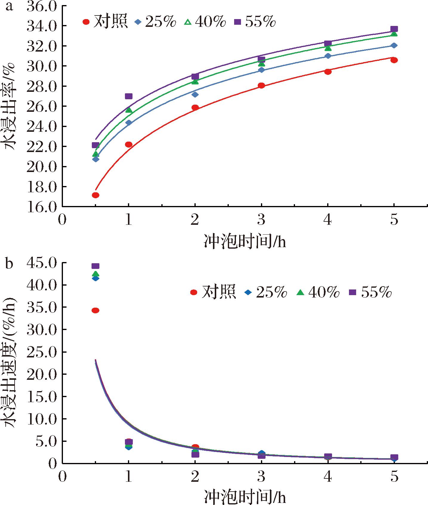 如表4所示,冷水冲泡时水浸物浸出率均随着冲泡时间的增加而增大,经相同冲泡时间,真空冷冻干燥茶坯的水浸出率均高于对照,且含水量越高,水浸出率越大;在冲泡0.5 h时,真空冷冻干燥茶坯增加水浸出率的值达最大,含水量25%、40%、55%真空冷冻干燥茶坯分别增加了3.59%、4.11%、4.97%。水浸物浸出速度均呈现减小趋势,在冲泡0.5 h内,真空冷冻干燥茶坯的水浸出速度均高于对照,且含水量越高,水浸出速度越快;冲泡时间0.5 h~2 h水浸出速度均急剧下降,且含水量越高,水浸出速度下降越快;在冲泡1 h时,对照的水浸出速度超过真空冷冻干燥茶坯,冲泡2 h后趋于一致。冷水冲泡时,水浸物浸出规律也呈现出与沸水冲泡时类似的规律,即与对照相比,茶坯含水量越高,真空冷冻干燥后其水浸出率及冲泡初始阶段(0~0.5 h)的浸出速度增加越明显;如图4、表5所示,冷水冲泡时,水浸出率与冲泡时间也呈对数函数关系Y=Aln(X)+B,R2为0.980 0~0.997 8,对数函数方程中常数项B分别为21.63、24.15、25.04、25.91,即B随含水量的增加而增大;水浸出速度与冲泡时间也呈幂函数关系Y=aXb,R2为0.914 8~0.994 8,幂函数方程中系数a分别为11.10、10.56、11.00、10.82,指数b分别为-1.48、-1.50、-1.48、-1.51,a、b随着含水量的增加并未呈现增加或减小的趋势。研究发现沸水泡茶更利于茶多酚的溶出[30],冷水浸泡茶叶中的游离氨基酸更易溶出[31],这可能是导致茶坯在冷水与沸水冲泡时水浸出物浸出规律呈现出差异性。