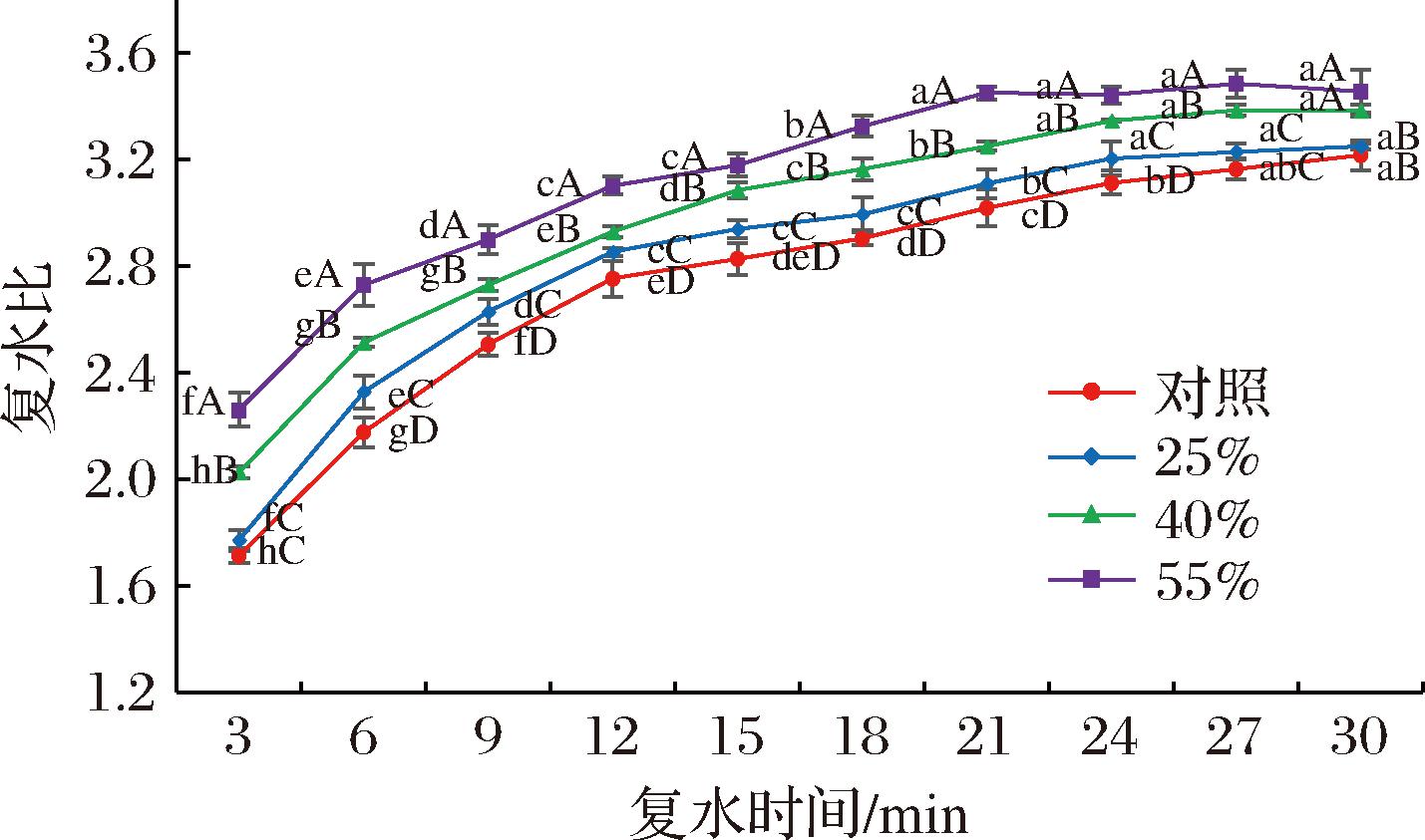 注:不同小写字母表示同一样品不同复水时间差异性显著,不同大写字母表示不同样品相同复水时间差异性显著(P<0.05)(下同)。
