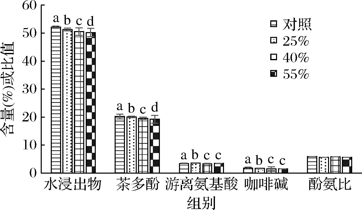 水浸出物总量参照GB/T 8305—2013《茶 水浸出物测定》测定;茶多酚总含量参照GB/T 8313—2018《茶叶中茶多酚和儿茶素类含量的检测方法》测定;游离氨基酸总量参照GB/T 8314—2013《茶 游离氨基酸总量的测定》测定;咖啡碱含量参照GB/T 8312—2013《茶 咖啡碱测定》测定。
