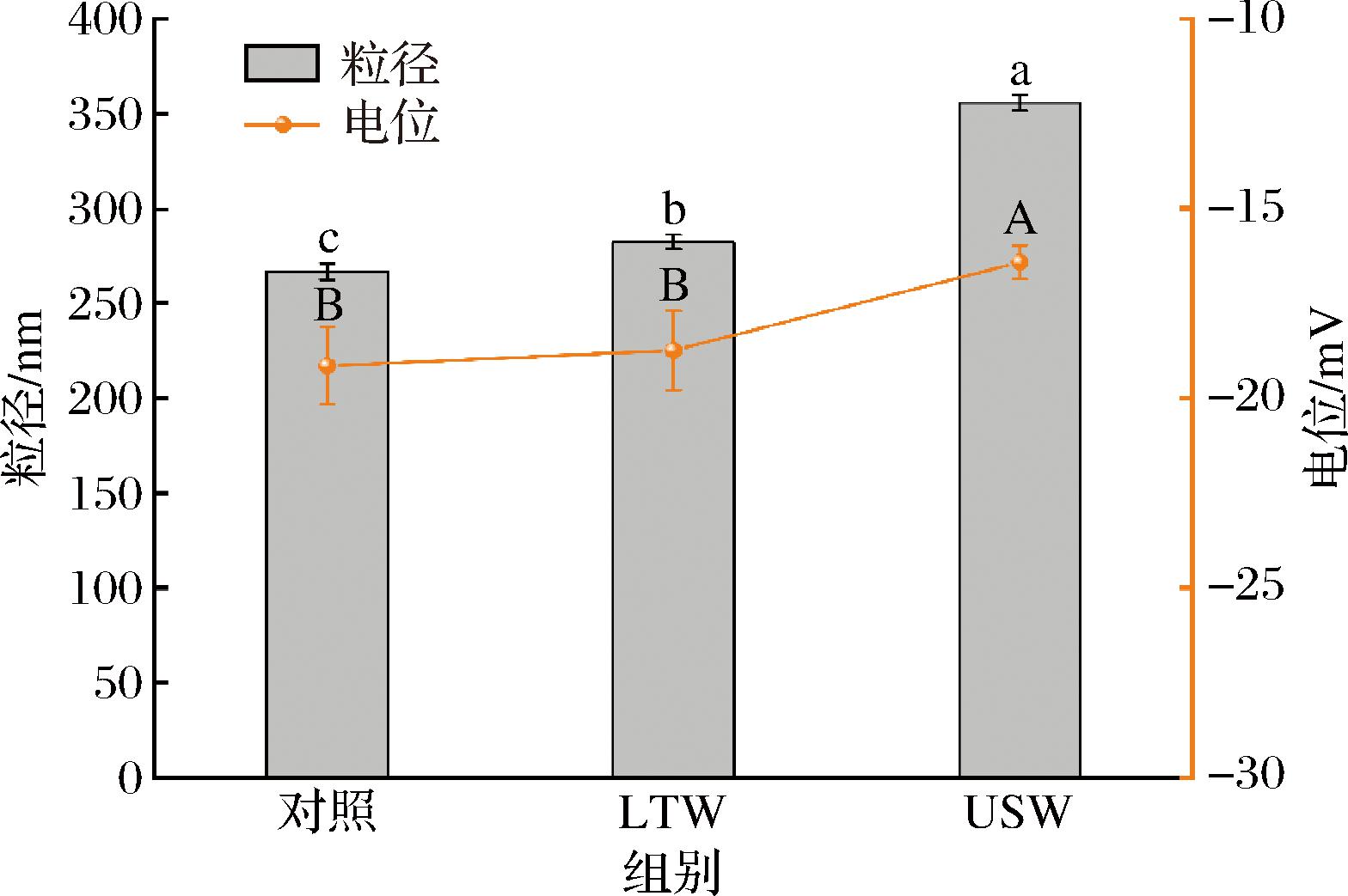 Zeta-电位可以反映溶液中颗粒的表面电荷特性,并描述颗粒之间的静电相互作用,zeta-电位的绝对值越大,蛋白质与水的相互作用就越强[19]。由结果可知,LTW组的电位与对照组并无显著性差异,而USW组电位的绝对值显著减小至(16.62±0.445) mV。这可能是一些负电荷基团被部分隐藏或因疏水相互作用而不易接触溶液时,蛋白质表面的电荷分布会发生变化,导致zeta-电位绝对值的减小[20]。