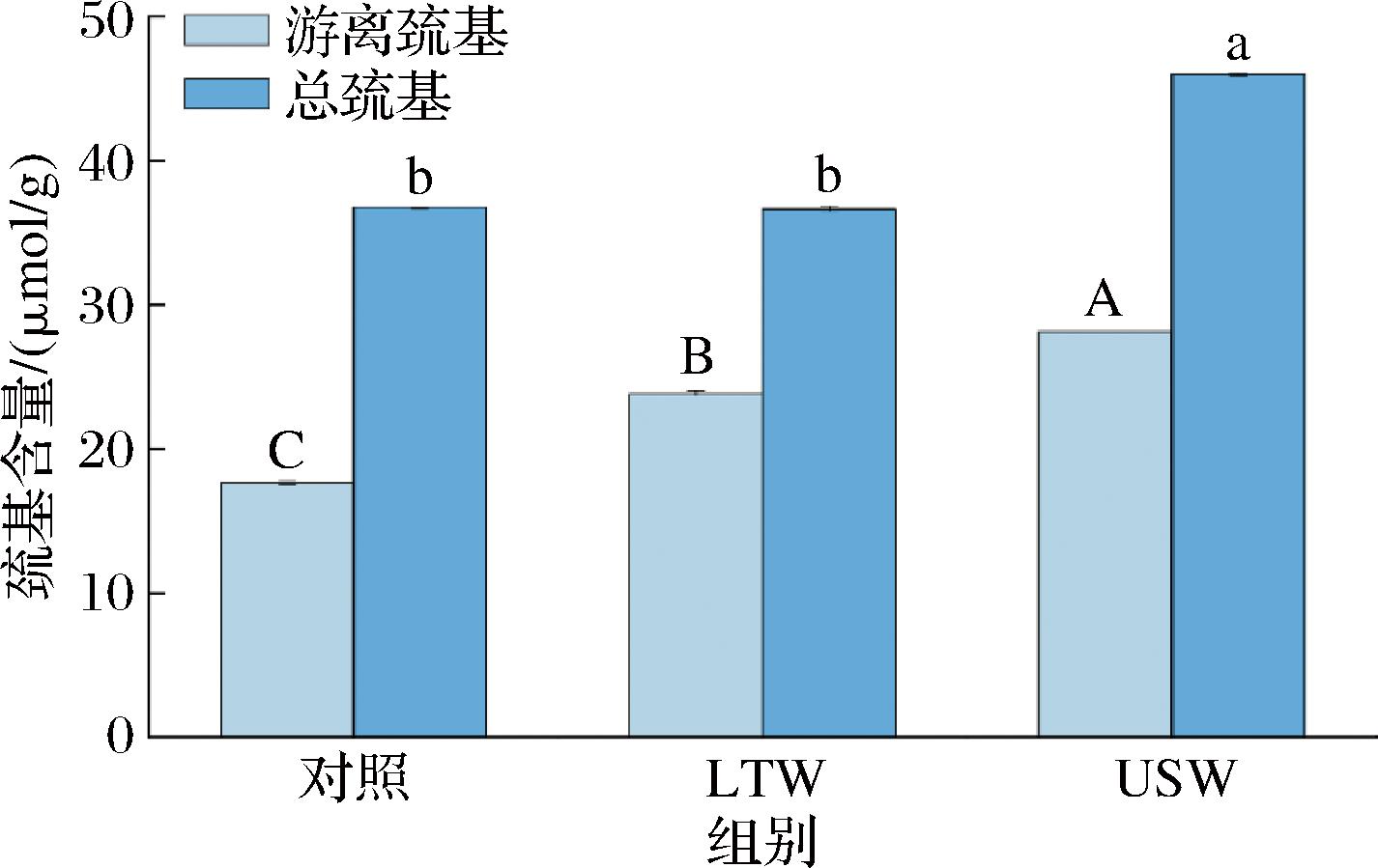 巯基是与蛋白质功能特性密切相关的官能团之一,其中游离巯基是蛋白质中包含半胱氨酸残基的活性基团,它在蛋白质的结构和功能中具有重要作用,总巯基包括游离巯基和已形成二硫键的巯基[24]。如图4所示,LTW组游离巯基含量[(23.87±0.15) μmol/g]显著增多,但总巯基含量[(36.67±0.19) μmol/g]无显著变化,这表明低温漂洗可能通过改变蛋白质的分子间相互作用(如疏水作用)暴露出更多的游离巯基,但未显著破坏二硫键或导致二硫键的断裂,因此总巯基变化不大。而USW组游离巯基含量[(28.16±0.13) μmol/g]和总巯基含量[(46.05±0.08) μmol/g]都显著增多,这可能是由于超声能够展开蛋白质分子并暴露内部的—SH基团,从而导致游离巯基增加[24]。同时还可能促使蛋白质结构的某些变化(如重新折叠或解聚),这些变化有可能在新的位置形成更多的二硫键,进而增加总巯基的含量。