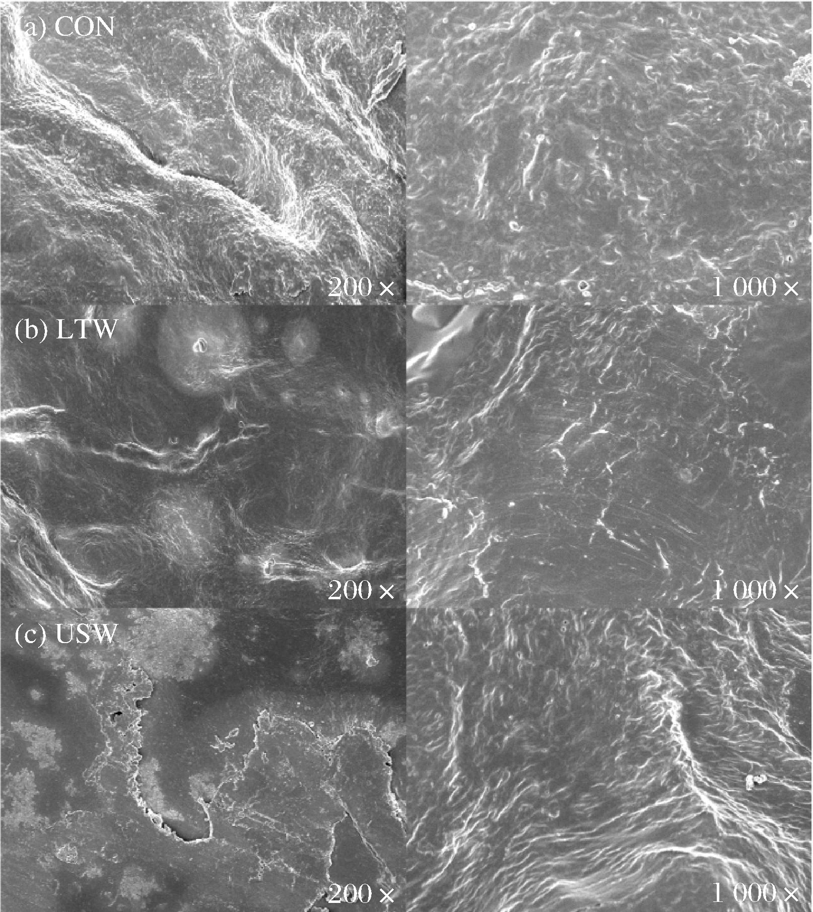参考薛紫曦等[13]的方法,并稍作修改。将不同处理组的样品真空冷冻干燥后,进行相同程度的破碎处理。随后,将处理后的样品均匀粘贴在导电胶上。对样品进行喷金处理后,将样品置于扫描电镜样品室中,在加速电压为5.00 kV的条件下进行观察,获取200倍和1 000倍的微观结构图像。