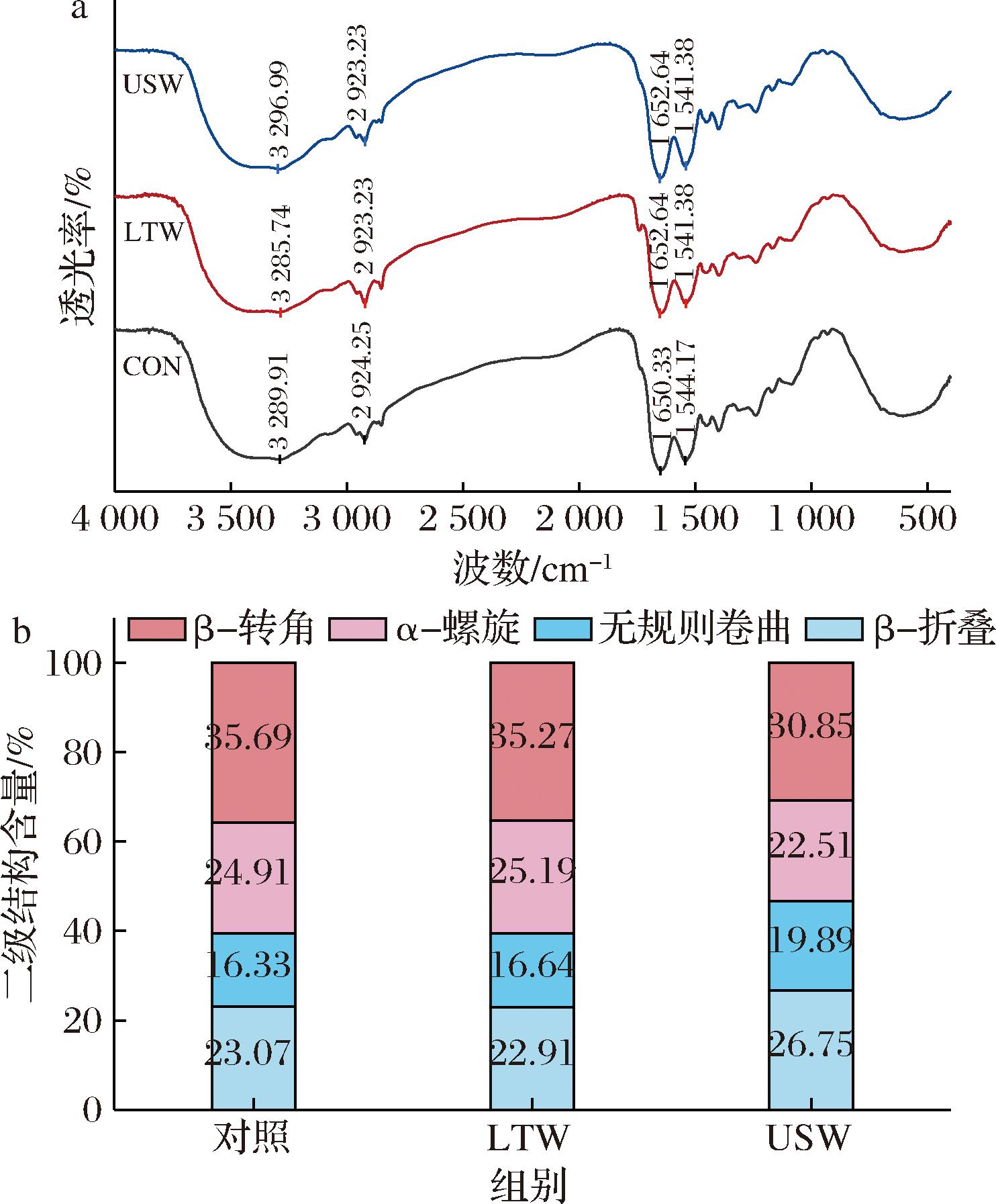 a-红外光谱;b-二级结构含量