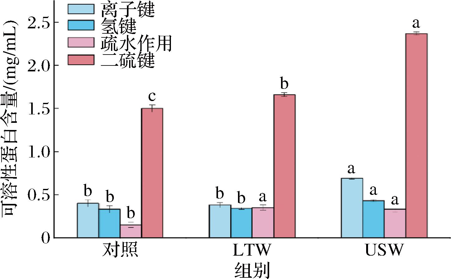 分子间作用力决定了蛋白质的空间构象及其功能。氢键和离子键对蛋白质的二级和三级结构至关重要,而疏水作用力和二硫键则有助于维持蛋白质的稳定性和功能性。如图3所示,与对照组和LTW组相比,USW组的离子键[(0.69±0.01) mg/mL]、氢键[(0.43±0.01) mg/mL]、[疏水作用(0.33±0.03) mg/mL]和二硫键[(2.37±0.02) mg/mL]都显著增强。这是因为超声能通过高频震荡力破坏蛋白质的空间结构,促使蛋白质解聚并重新折叠,或使蛋白质的疏水区域可能暴露出来,导致这些区域的极性基团(如氨基和羧基)之间形成更多的氢键和离子键[22];还可能使蛋白质部分解聚,令原本被二硫键稳定的二级结构部分解构,从而暴露更多的游离巯基,促进了蛋白质中半胱氨酸残基之间的形成二硫键[23]。