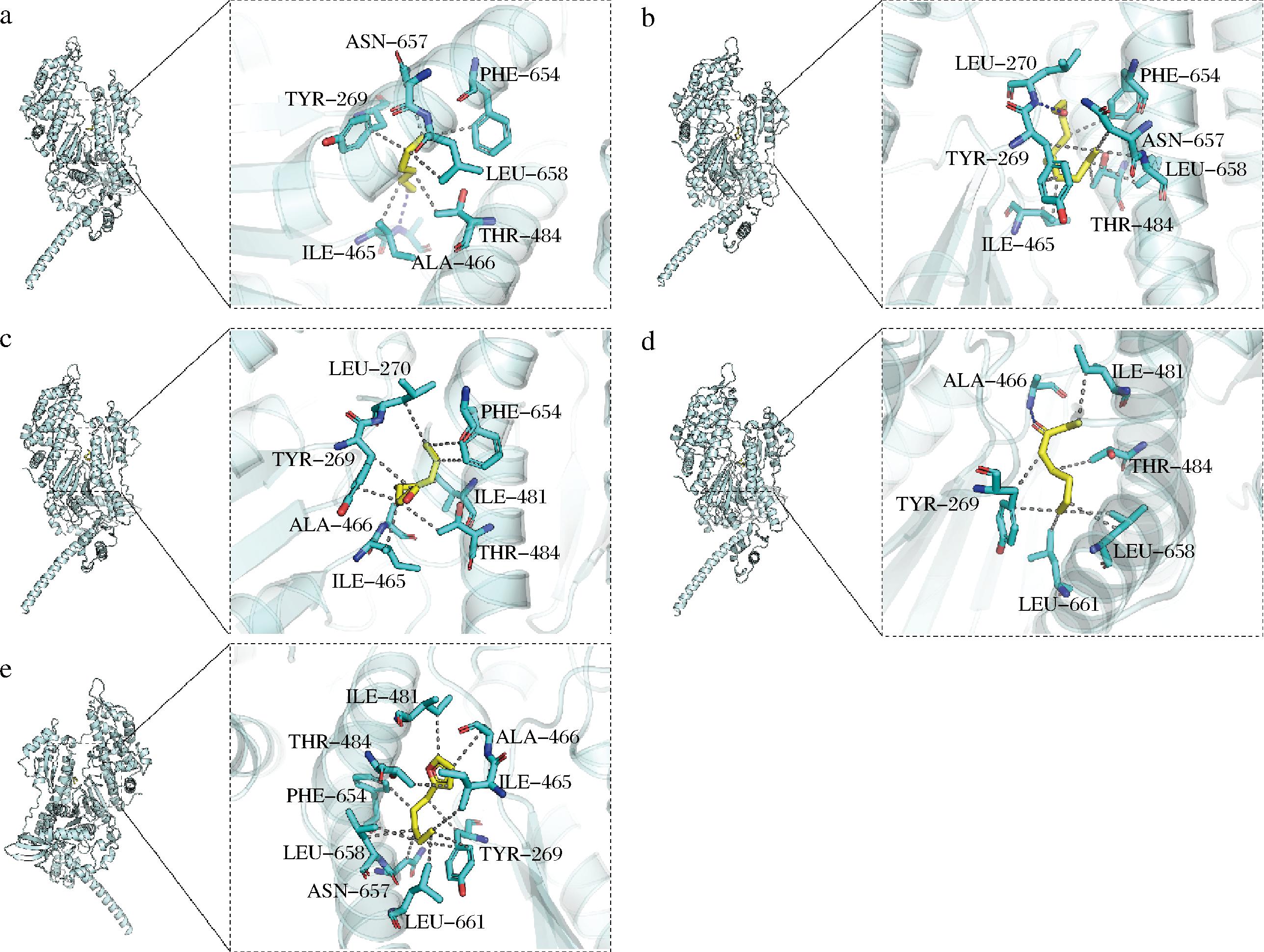 如图8所示,己醛通过氢键作用与肌原纤维蛋白中的ALA-466残基形成稳定结合。此外,己醛与蛋白质中的TYR-269、ASN-657、PHE-654、LEU-658、THR-484、ILE-465等疏水性氨基酸残基发生疏水相互作用。尤其是TYR-269和ILE-465,它们的芳香族侧链和疏水性侧链为己醛提供了理想的结合环境。氢键和疏水作用共同促进了己醛与肌原纤维蛋白的紧密结合,从而对肉类的风味和结构产生重要影响。图8-b展示了十一醛与肌原纤维蛋白上的LEU-270形成氢键作用,这种氢键作用强化了小分子与蛋白质的结合紧密性。同时,十一醛通过疏水作用与蛋白质中的THR-484、ASN-657、TYR-269、ILE-465、PHE-654、LEU-658等氨基酸残基相互作用,促进了两者的结合。图8-c展示了(E,E)-2,4-癸二烯醛与肌原纤维蛋白中的LEU-270、PHE-654、ILE-481、THR-484、ILE-465、ALA-466、TYR-269等氨基酸残基通过疏水作用紧密结合,带有共轭双键的(E,E)-2,4-癸二烯醛通过π-π共振相互作用,提高蛋白质和小分子结合的稳定性[29]。如图8-d所示,1-辛烯-3-酮与肌原纤维蛋白中的ALA-466形成氢键作用,同时还通过疏水性相互作用与蛋白质上的ILE-481、THR-484、LEU-658、LEU-661、TYR-269等氨基酸残基相互作用。图8-e展示了2-戊基呋喃与肌原纤维蛋白中的ILE-481、ALA-466、ILE-465、TYR-269、LEU-661、ASN-657、LEU-658、PHE-654、THR-484等氨基酸残基通过疏水作用进一步巩固了小分子与蛋白质的相互作用。这些相互作用不仅增强了风味分子的结合能力,还对肉类的口感和风味特性产生了重要影响[30]。总的来说,图8的分子对接模拟揭示了不同风味物质与肌原纤维蛋白之间的多种结合模式,氢键和疏水作用是促使风味分子与蛋白质结合的重要相互作用力[31],这些相互作用显著增强了风味物质与蛋白质的结合稳定性,进一步影响了肉类的风味及整体感官体验。