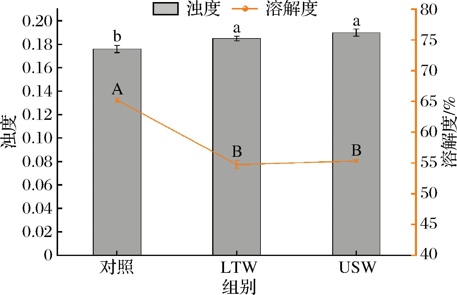 浊度是反映蛋白质聚集程度的指标,浊度的增加表明肌原纤维蛋白颗粒的聚集程度增加[21]。如图2所示,LTW组和USW组的肌原纤维蛋白的浊度分别为0.185±0.002和0.190±0.003,较对照组的0.176±0.003显著增加。这可能是由于肌原纤维蛋白的粒径增大,从而导致的浊度上升。浊度的上升这一趋势与粒径增大、zeta-电位绝对值下降一致,反映了超声会影响蛋白质的结构。在溶解度上,对照组(65.24±0.33)%显著高于LTW组(54.75±0.64)%和USW组(55.31±0.23)%,可能是由于对照组较小的粒径分布与较低的浊度,使其分散体系更稳定,同时较高的zeta-电位绝对值通过增强静电稳定作用抑制了蛋白聚集,所以肌原纤维蛋白能保持较好的分散性和溶解度。
