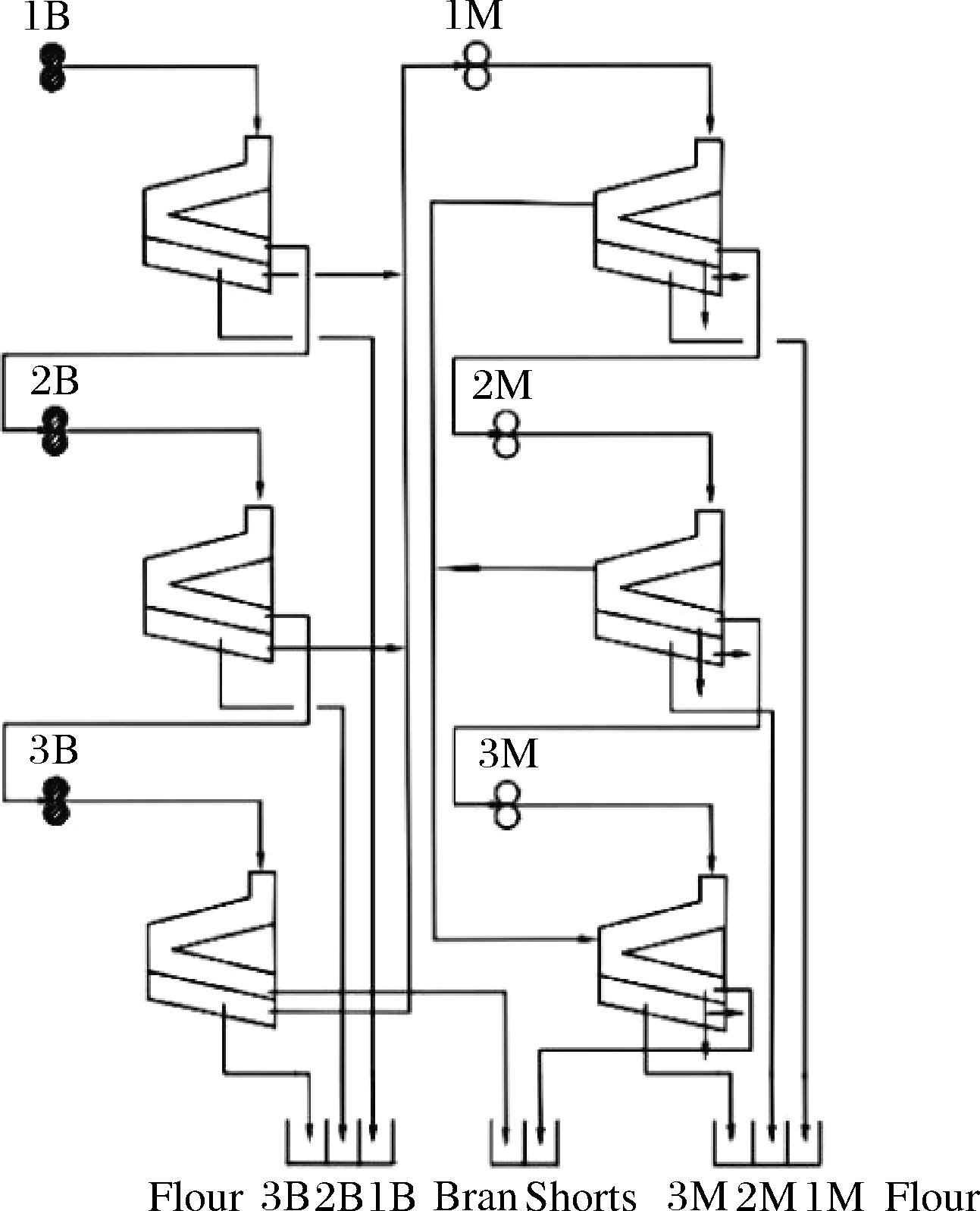 小麦实验制粉方法参考NY/T 1094.5—2006《小麦实验制粉 第5部分:Brabender Quadrumat Jr.(Quadruplex)实验磨法》,Brabender Jr.实验磨制粉流程如图1所示。实验室内磨粉条件为:温度21~23 ℃,相对湿度53%,下同。