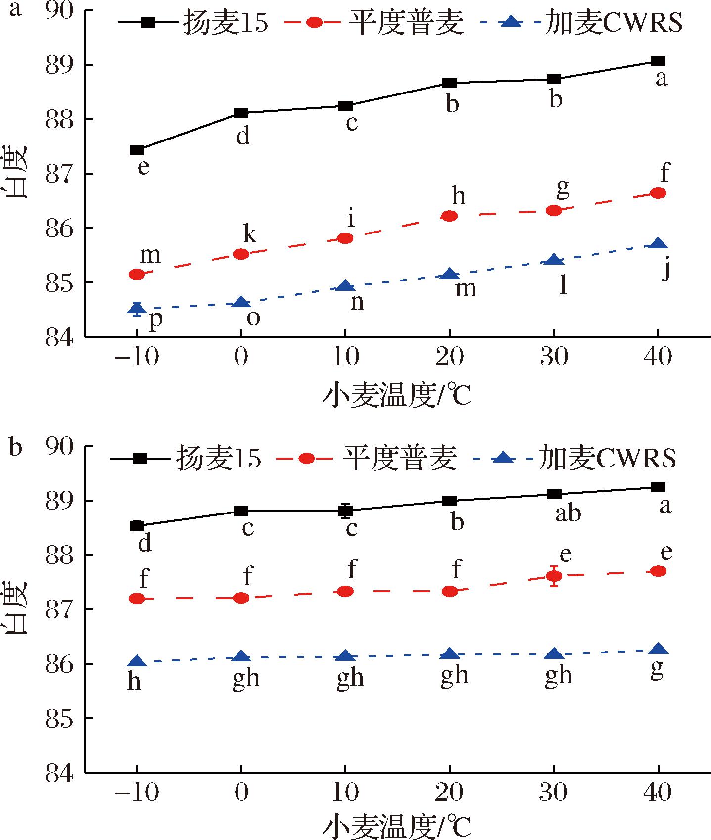 图5 不同温度小麦对磨粉后面粉白度的影响