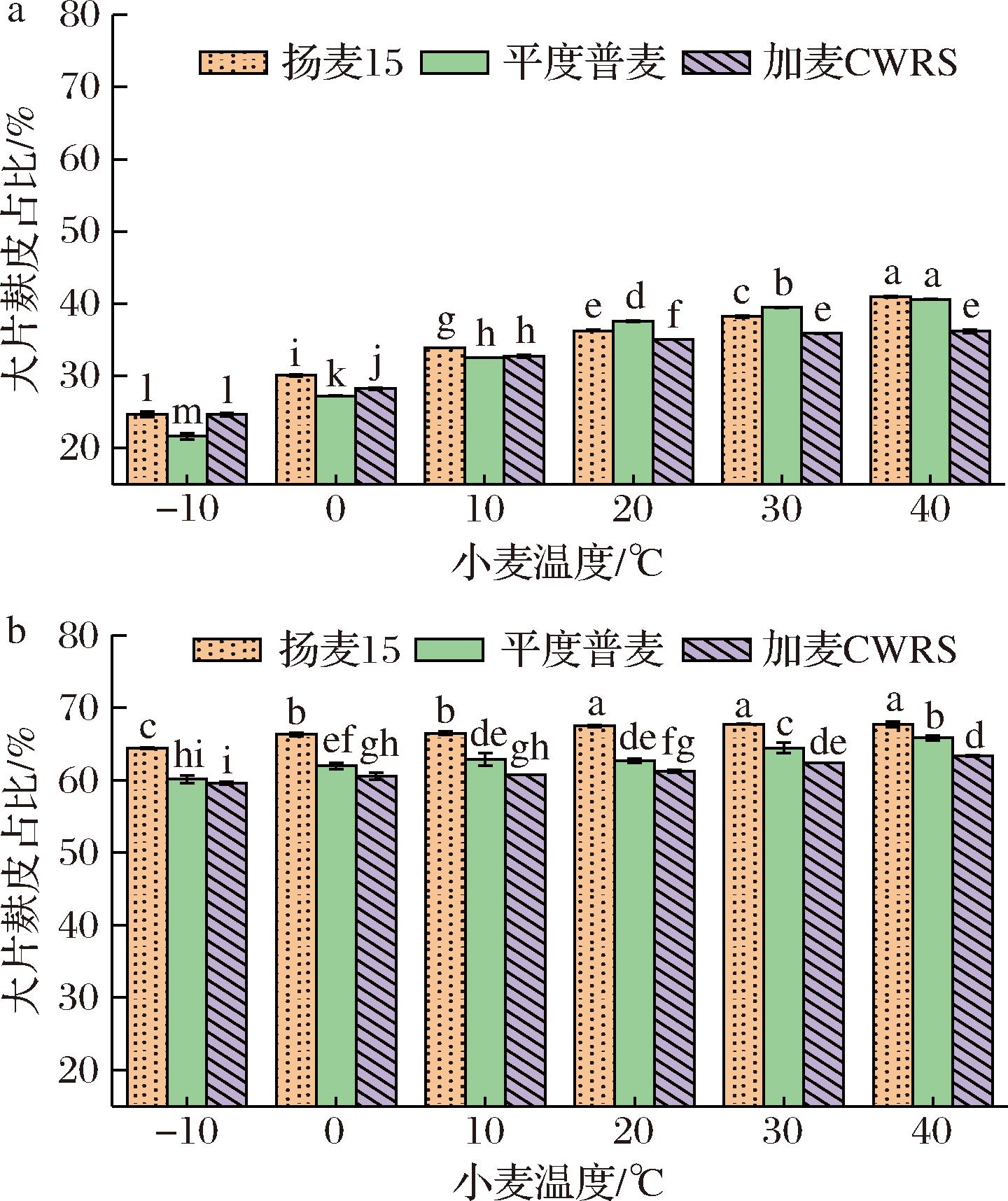将3种不同温度的小麦用2种实验磨进行磨粉,所得到的麸皮经20 W筛网筛分,筛分后麸皮中的大片麸皮占比结果如图3所示。明显地,麸皮经筛分后,每种小麦的大片麸皮占比均随着小麦温度的升高逐渐增多。其原因是,当小麦温度低时籽粒硬度较大,表皮较脆而韧性较差,更容易被破碎,因而产生更多碎麸屑。而随着小麦温度的升高,小麦表皮韧性逐渐增强,不容易被破碎,因此更易产生较大片状的麸皮。程敏等[20]也研究发现,随着实验温度的降低,小麦皮层的脆性逐渐增强,会逐渐由弹塑性材料转变为脆性材料,进一步肯定了此结论。实验结果还可以看出,扬麦15(软麦)的麸皮经筛分后,其麸皮中大片占比比另2种小麦要高,尤其在0 ℃及以下低温条件时更为明显。正如GREFFEUILLE等[21]的实验研究显示,不同硬度的小麦,其麸皮的机械性能存在显著差异,软质小麦籽粒的麸皮延展性更高、韧性更大,因此在受到外力作用时,能通过自身弹性形变来减少破碎的可能性。总而言之,在气温较低时给小麦适度加热,能有效提高麸皮的完整度,减少麸屑混入小麦粉中,从而提升小麦粉的应用品质。