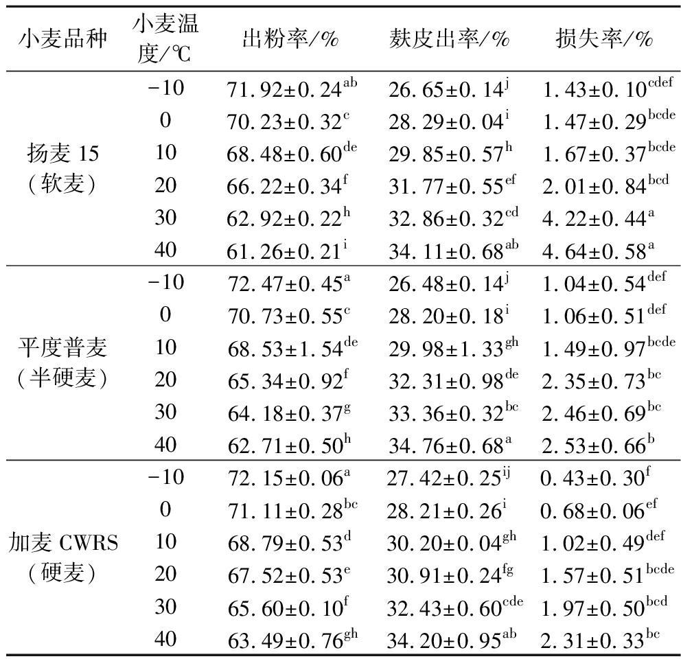 小麦品种小麦温度/℃出粉率/%麸皮出率/%损失率/%扬麦15(软麦)-1071.92±0.24ab26.65±0.14j1.43±0.10cdef070.23±0.32c28.29±0.04i1.47±0.29bcde1068.48±0.60de29.85±0.57h1.67±0.37bcde2066.22±0.34f31.77±0.55ef2.01±0.84bcd3062.92±0.22h32.86±0.32cd4.22±0.44a4061.26±0.21i34.11±0.68ab4.64±0.58a平度普麦(半硬麦)-1072.47±0.45a26.48±0.14j1.04±0.54def070.73±0.55c28.20±0.18i1.06±0.51def1068.53±1.54de29.98±1.33gh1.49±0.97bcde2065.34±0.92f32.31±0.98de2.35±0.73bc3064.18±0.37g33.36±0.32bc2.46±0.69bc4062.71±0.50h34.76±0.68a2.53±0.66b加麦CWRS(硬麦)-1072.15±0.06a27.42±0.25ij0.43±0.30f 071.11±0.28bc28.21±0.26i0.68±0.06ef1068.79±0.53d30.20±0.04gh1.02±0.49def2067.52±0.53e30.91±0.24fg1.57±0.51bcde3065.60±0.10f32.43±0.60cde1.97±0.50bcd4063.49±0.76gh34.20±0.95ab2.31±0.33bc