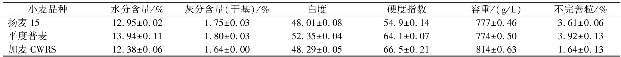 扬麦15(软质小麦),润麦水分14%;青岛平度普麦(半硬质小麦),润麦水分15%;加拿大西红春小麦CWRS(硬质小麦),润麦水分16%。小麦样品基本品质指标如表1所示。
