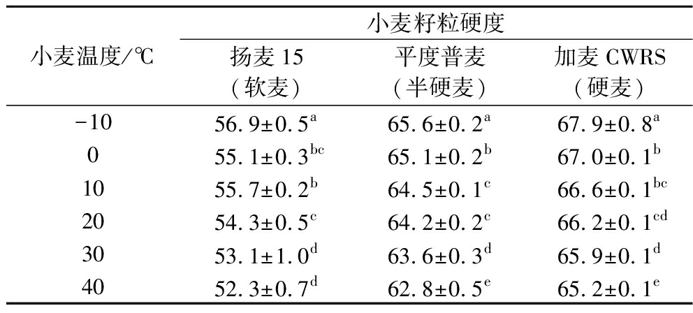 小麦温度/℃小麦籽粒硬度扬麦15(软麦)平度普麦(半硬麦)加麦CWRS(硬麦)-1056.9±0.5a65.6±0.2a67.9±0.8a055.1±0.3bc65.1±0.2b67.0±0.1b1055.7±0.2b64.5±0.1c66.6±0.1bc2054.3±0.5c64.2±0.2c66.2±0.1cd3053.1±1.0d63.6±0.3d65.9±0.1d4052.3±0.7d62.8±0.5e65.2±0.1e