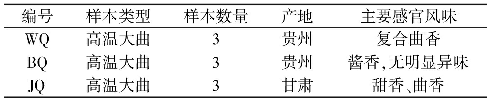 基础大曲样本:本研究中的3种基础大曲样本分别采集于贵州省和甘肃省的3个不同酒厂,其编号分别为WQ、BQ和JQ,它们具有不同感官风味特征。各选取3块新鲜出房曲作为平行样本,具体信息见表1。将大曲样本磨成细粉后取200 g分装至自封袋中,及时转移至-80 ℃冰箱保存。