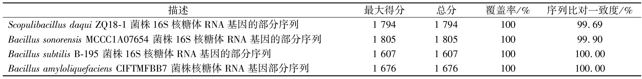 描述最大得分总分覆盖率/%序列比对一致度/%Scopulibacillus daqui ZQ18-1 菌株16S核糖体RNA基因的部分序列1 7941 79410099.69Bacillus sonorensis MCCC1A07654 菌株16S核糖体RNA基因的部分序列1 8051 80510099.90Bacillus subtilis B-195 菌株16S核糖体RNA基因的部分序列1 6071 607100100.00Bacillus amyloliquefaciens CIFTMFBB7 菌株核糖体RNA基因部分序列1 6761 676100100.00