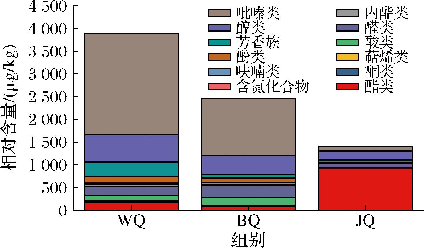 前期研究发现,来自不同酒厂的3种大曲WQ、BQ和JQ具有不同的感官风味特征,WQ大曲具有较浓的复合曲香,BQ大曲具有酱香味且无明显异味,JQ大曲具有甜香和粮香。为进一步探究3种大曲中风味化合物的组成,通过HS-SPME-GC-MS在全部基础大曲样本中检测出134种挥发性化合物,通过Flavornet Home(http://www.flavornet.org/index.html)、Flavor DB(https://cosylab.iiitd.edu.in/flavordb/)数据库以及文献检索进行比对,结合风味描述和阈值明确挥发性物质对香气的贡献。共对比出81种香气化合物。三者具有不同的主体香气物质,且WQ和BQ香气化合物的含量明显高于JQ(图1)。吡嗪类物质是WQ和BQ大曲中的主要香气化合物,相对含量分别为2 228.42、1 264.83 μg/kg,分别占据总相对含量的55.73%、49.21%。WQ中其他丰度较高的物质为醇类化合物(16.28%),其次为芳香族化合物(9.62%)。BQ中其他丰度较高的化合物依次是醇类、醛类,分别占比18.01%、10.17%。JQ酯类化合物相对含量为927.72 μg/kg,占比66.30%,其次为醇类、吡嗪类,相对含量分别为196.64、95.17 μg/kg,占比14.05%、6.80%,这分别与邓阿玲等[5]和王高伟等[16]的研究结果相似。