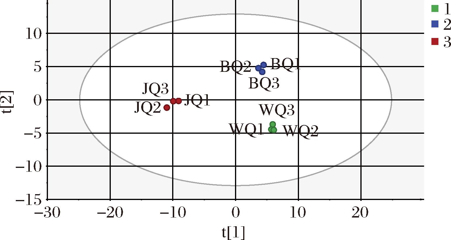 为初步了解不同大曲香气组分的差异,对已确定的81种风味化合物进行偏最小二乘判别分析(partial least squares discriminant analysis,PLS-DA)。WQ、BQ和JQ明显聚为3类,它们香气组分之间存在较大的差异(图2)。通过变量投影重要性指标(variable importance in the projection,VIP)分析,发现共有31种香气化合物的VIP>1,这表明这些物质可以被认为是区分不同大曲样本的重要的香气化合物,具体信息如电子版增强出版附表1所示(https://doi.org/10.13995/j.cnki.11-1802/ts.042486,下同)。其中包含10种吡嗪类化合物,占全部特征香气化合物的48.39%,且在WQ、BQ中具有较高浓度,可以被视作区分不同主体风味大曲的重要风味物质类别。