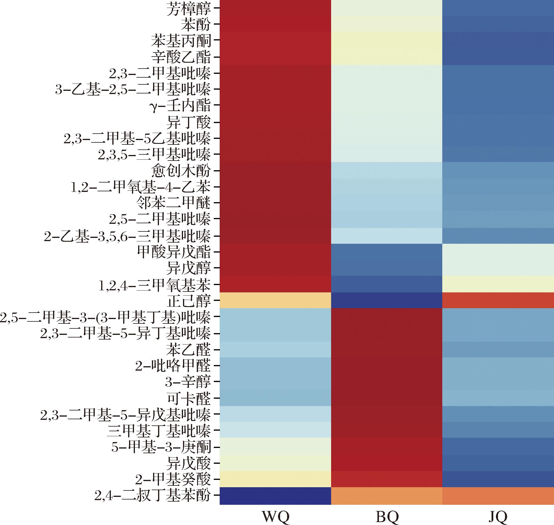 将这31种香气化合物绘制聚类热图,如图3所示。将大曲中相对含量较高的重要香气组分判定为其对应的特征香气化合物,不同的大曲中特征香气化合物的种类和含量具有较为明显的特征。将WQ中的特征香气组分最多,其中,2,3,5-三甲基吡嗪被认为是黑曲中含量较高的吡嗪类物质之一[17],是“酱香”的主要贡献者[18]。2,3-二甲基-5-乙基吡嗪、2,5-二甲基吡嗪、3-乙基-2,5-二甲基吡嗪和2,3-二甲基吡嗪等物质被较多研究认为可以为白酒风味贡献坚果香、烘焙香[19],同时对其他香气具有烘托叠加作用。异戊醇和苯酚被认为是酱香型高温大曲发酵过程中的差异物质[20],愈创木酚曾被报道过其可以为高品质中高温大曲构建木香香气[21]。同时,γ-壬内酯、异丁酸、芳樟醇、苯基丙酮和甲酸异戊酯等在WQ中具有较高的浓度。BQ的特征香气化合物中,三甲基丁基吡嗪、2-吡咯甲醛和可卡醛可以为大曲风味提供坚果、咖啡和可可香,2-甲基癸酸与大曲的酸腐味有关[22],苯乙醛对大曲的粮香具有重要贡献[23]。此外,2,3-二甲基-5-异丁基吡嗪、2,3-二甲基-5-异戊基吡嗪、2,5-二甲基-3-(3-甲基丁基)吡嗪以及3-辛醇具有青草香特征,它们在以往的相关研究中较少被提及。而孙细珍等[19]的香气缺失实验结果表明,吡嗪类物质也会对酱香白酒的青草香与花香存在一定的影响,因此,这些化合物可能在白酒风味形成中扮演重要角色。JQ浓度较高的差异香气化合物最少,只有正己醇和2,4-二叔丁基苯酚。其中,正己醇在以往研究中被发现其含量与发酵温度呈现负相关[24]。2,3-二甲基-5-乙基吡嗪和异戊酸被认为是大曲在高温发酵阶段的特征物质[24],他们分别存在于WQ和BQ的特征香气化合物中,这侧面反映出与其他2种样本相比,JQ的发酵温度相对较低。