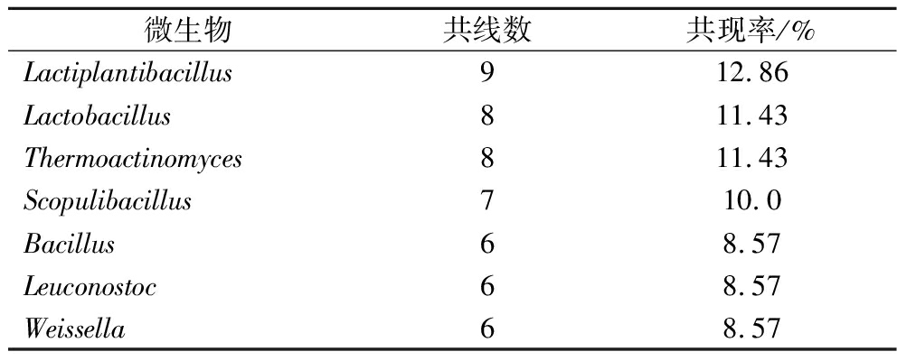 微生物共线数共现率/%Lactiplantibacillus912.86Lactobacillus811.43Thermoactinomyces811.43Scopulibacillus710.0Bacillus68.57Leuconostoc68.57Weissella68.57