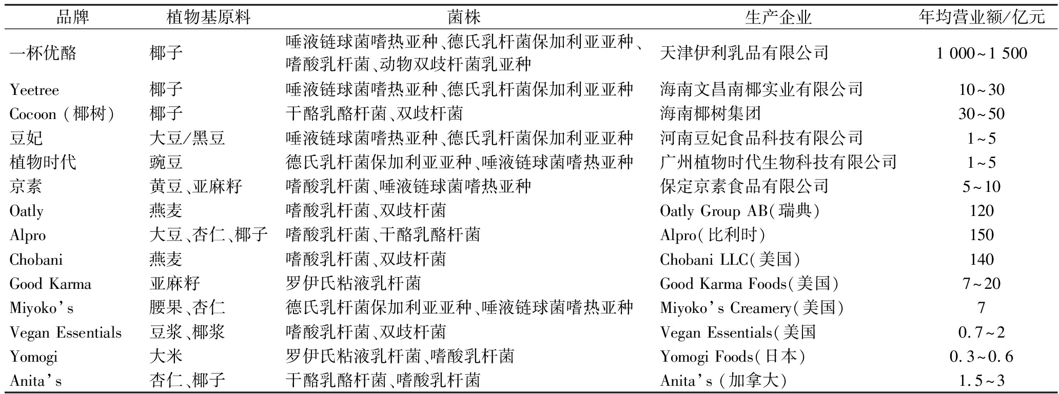 品牌植物基原料菌株生产企业年均营业额/亿元一杯优酪椰子唾液链球菌嗜热亚种、德氏乳杆菌保加利亚亚种、嗜酸乳杆菌、动物双歧杆菌乳亚种天津伊利乳品有限公司1 000~1 500Yeetree椰子唾液链球菌嗜热亚种、德氏乳杆菌保加利亚亚种海南文昌南椰实业有限公司10~30Cocoon (椰树)椰子干酪乳酪杆菌、双歧杆菌海南椰树集团30~50豆妃大豆/黑豆唾液链球菌嗜热亚种、德氏乳杆菌保加利亚亚种河南豆妃食品科技有限公司1~5植物时代豌豆德氏乳杆菌保加利亚亚种、唾液链球菌嗜热亚种广州植物时代生物科技有限公司1~5京素黄豆、亚麻籽嗜酸乳杆菌、唾液链球菌嗜热亚种保定京素食品有限公司5~10Oatly燕麦嗜酸乳杆菌、双歧杆菌Oatly Group AB(瑞典)120Alpro大豆、杏仁、椰子嗜酸乳杆菌、干酪乳酪杆菌Alpro(比利时)150Chobani燕麦嗜酸乳杆菌、双歧杆菌Chobani LLC(美国)140Good Karma亚麻籽罗伊氏粘液乳杆菌Good Karma Foods(美国)7~20Miyoko’s腰果、杏仁德氏乳杆菌保加利亚亚种、唾液链球菌嗜热亚种Miyoko’s Creamery(美国)7Vegan Essentials豆浆、椰浆嗜酸乳杆菌、双歧杆菌Vegan Essentials(美国0.7~2Yomogi大米罗伊氏粘液乳杆菌、嗜酸乳杆菌Yomogi Foods(日本)0.3~0.6Anita’s杏仁、椰子干酪乳酪杆菌、嗜酸乳杆菌Anita’s (加拿大)1.5~3