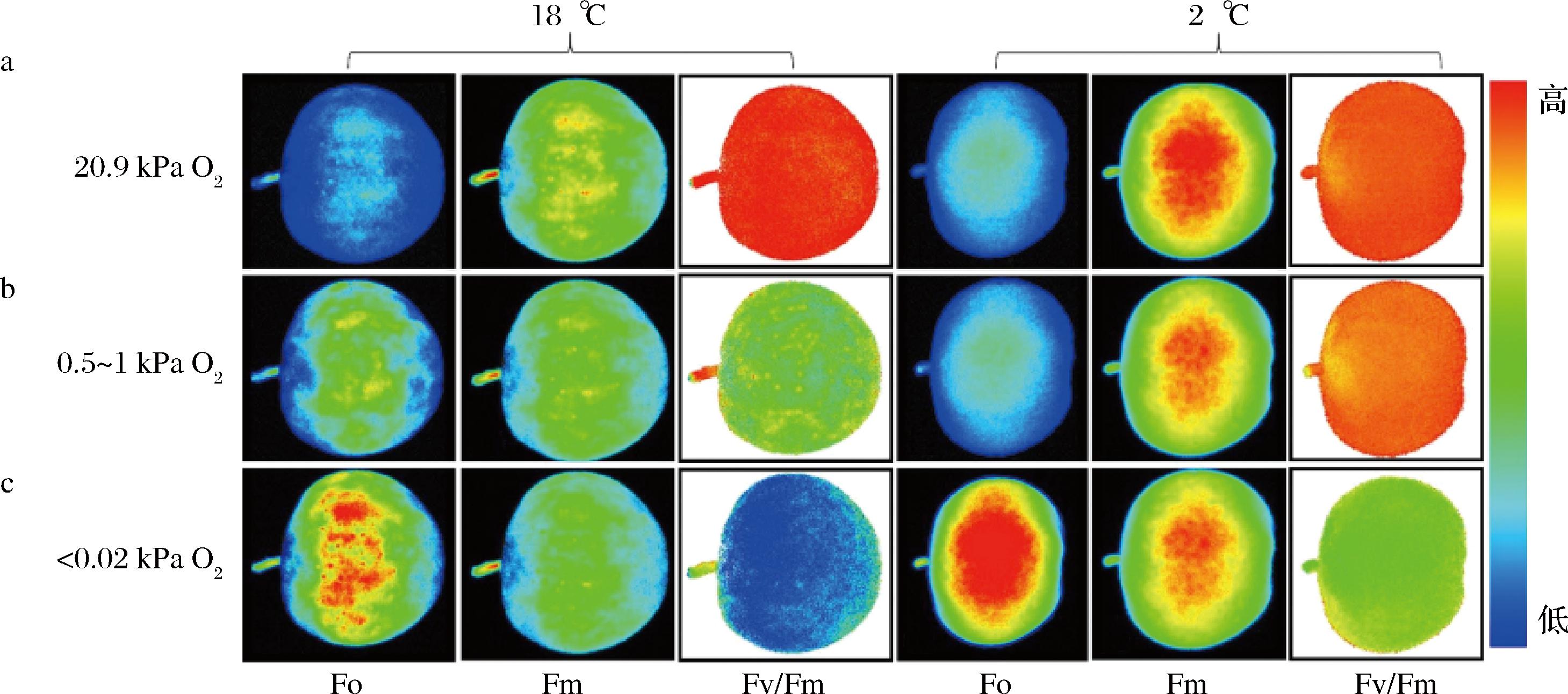 DCA-CF技术是指在气调贮藏期间,通过实时监测苹果果皮在气调环境下的叶绿素荧光响应,及时调整库内气体浓度的一项技术。通常,当苹果感受到低氧胁迫时,其代谢活动受到影响,特别是苹果光合效率下降,果皮叶绿素荧光信号显著增强,表明果实可能接近低氧生理极限[9]。一般认为荧光参数F0(基础荧光)是检测果实低氧胁迫的最敏感参数,在低氧胁迫下,苹果的F0急剧升高,而Fv/Fm(PSⅡ最大光化学量子产量)则降低。正常苹果的Fv/Fm约为0.7~0.8,若低于0.65则提示受到低氧胁迫,需提高O2浓度[22]。SCHLIE等[25]通过FluorCam荧光成像系统对低氧胁迫条件下的苹果进行测定,发现在2 ℃和18 ℃条件下,荧光信号F0和Fv/Fm均能感受超低氧胁迫(图1),与18 ℃相比,2 ℃贮藏时苹果的F0和Fm(最大荧光)的波动和荧光信号更为明显,能更灵敏地反映果实遭受低氧胁迫的程度,并且,低温环境会减缓Fv/Fm的下降速度,为优化贮藏条件争取了更长的时间。因此,通过实施监测叶绿素荧光参数的变化,操作者可以及时调整贮藏环境的气体成分,确保长期气调贮藏条件下果实不出现低氧伤害。