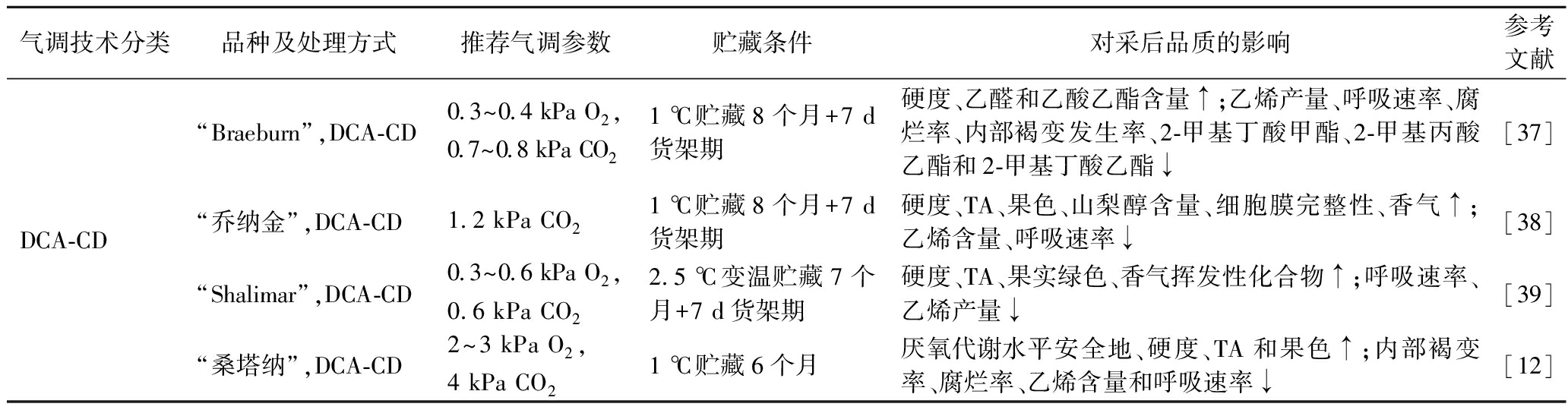 气调技术分类品种及处理方式推荐气调参数贮藏条件对采后品质的影响参考文献DCA-CD“Braeburn”,DCA-CD0.3~0.4 kPa O2,0.7~0.8 kPa CO21 ℃贮藏8个月+7 d货架期硬度、乙醛和乙酸乙酯含量↑;乙烯产量、呼吸速率、腐烂率、内部褐变发生率、2-甲基丁酸甲酯、2-甲基丙酸乙酯和2-甲基丁酸乙酯↓[37]“乔纳金”,DCA-CD1.2 kPa CO21 ℃贮藏8个月+7 d货架期硬度、TA、果色、山梨醇含量、细胞膜完整性、香气↑;乙烯含量、呼吸速率↓[38]“Shalimar”,DCA-CD0.3~0.6 kPa O2,0.6 kPa CO22.5 ℃变温贮藏7个月+7 d货架期硬度、TA、果实绿色、香气挥发性化合物↑;呼吸速率、乙烯产量↓[39]“桑塔纳”,DCA-CD2~3 kPa O2,4 kPa CO21 ℃贮藏6个月厌氧代谢水平安全地、硬度、TA和果色↑;内部褐变率、腐烂率、乙烯含量和呼吸速率↓[12]