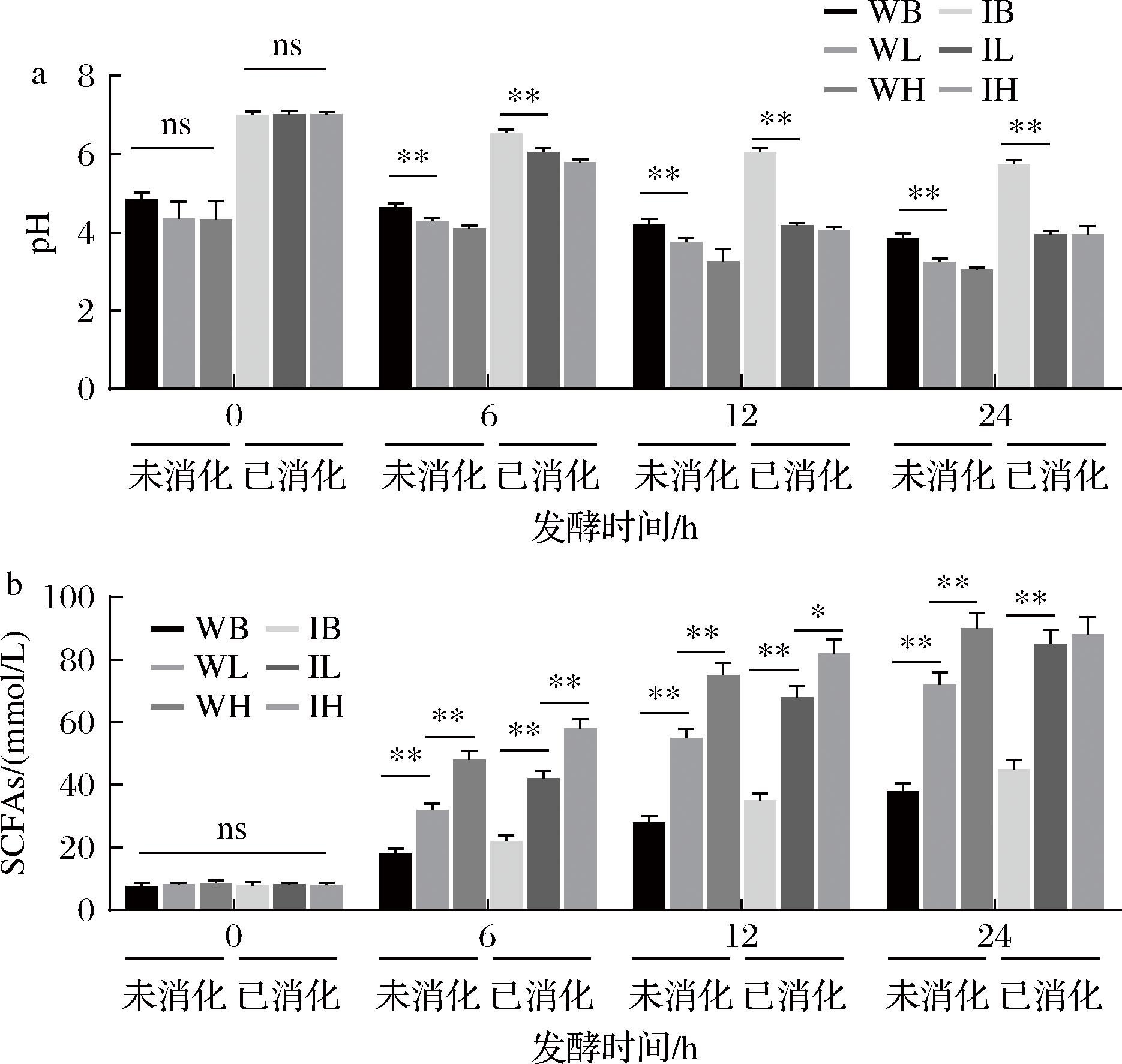 注:WB组为未消化空白组、WL为未消化低剂量组、WH为未消化高剂量组、IB为已消化空白组、IL为已消化低剂量组、IH为已消化高剂量组;ns表示组间无显著性差异(下同)。