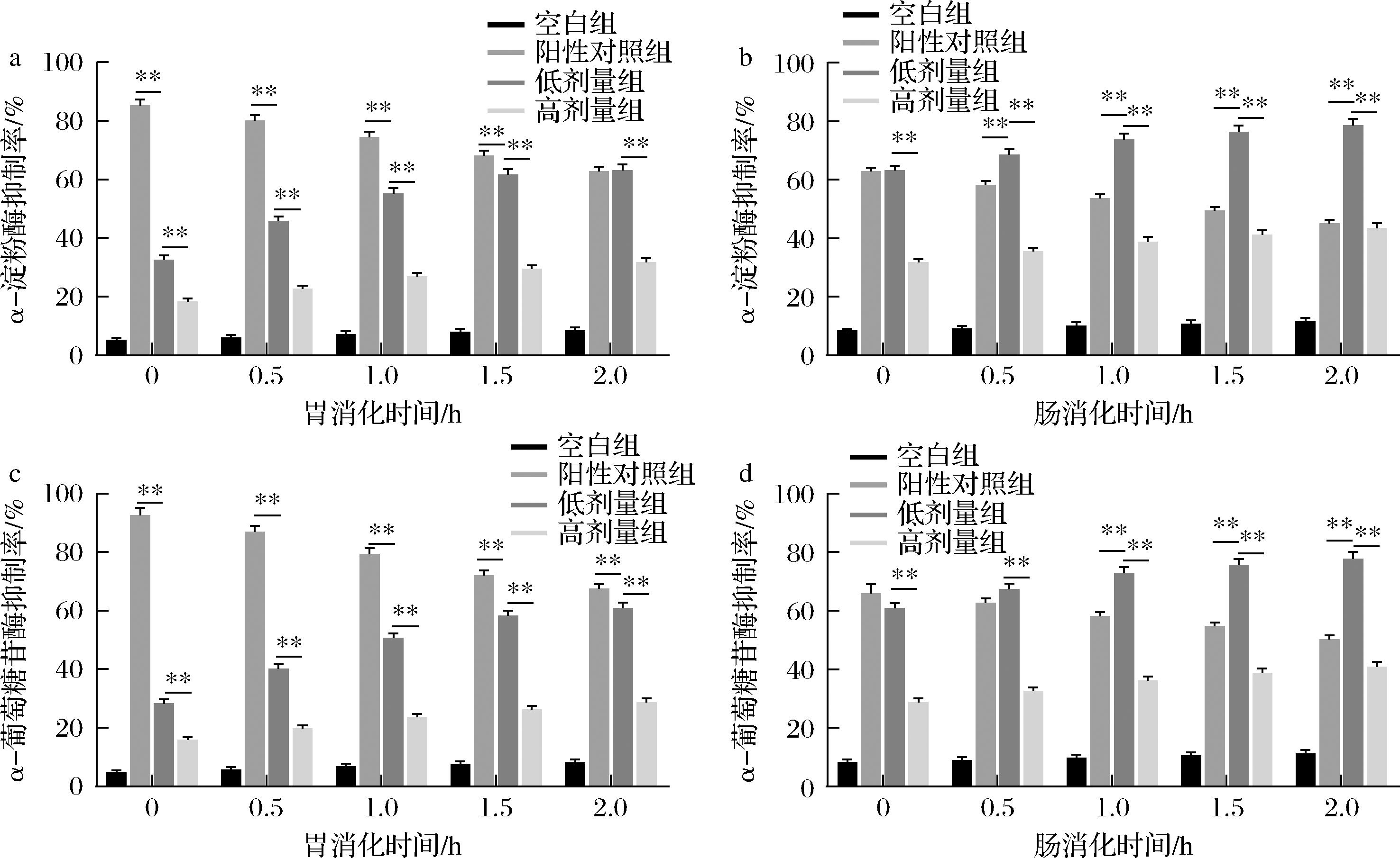 a-胃消化阶段α-淀粉酶抑制率;b-肠消化阶段α-淀粉酶抑制率;c-胃消化阶段α-葡萄糖苷酶抑制率;d-肠消化阶段α-葡萄糖苷酶抑制率