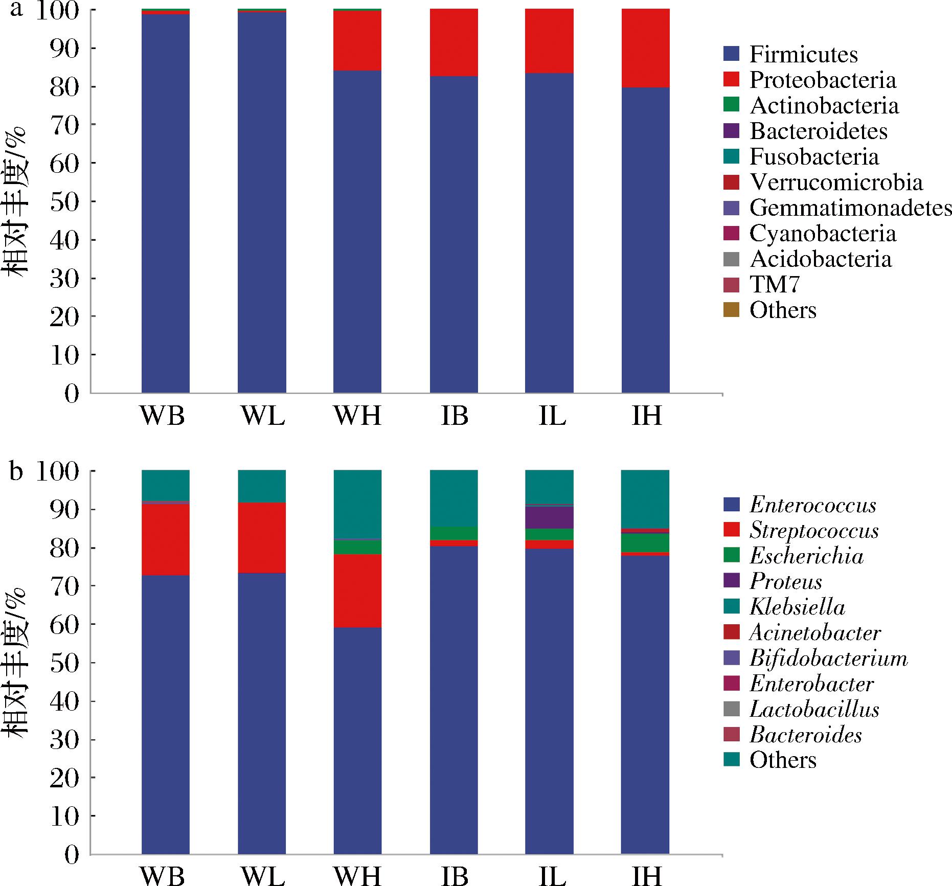 如图6-a所示,整体上,厚壁菌门(Firmicutes)在所有组中均占主导地位,相对丰度均超过80%。在未消化组中,随着CIP添加量的增加,变形菌门(Proteobacteria)的相对丰度呈上升趋势,WH组中达到约15%,显著高于空白组WB(低于5%)。在已消化组中,该趋势更加明显,高剂量组(IH)Proteobacteria 丰度持续上升,表明其在模拟胃肠环境下更容易富集。放线菌门(Actinobacteria)和拟杆菌门(Bacteroidetes)在各组中丰度较低,且未表现出明显的剂量相关变化。