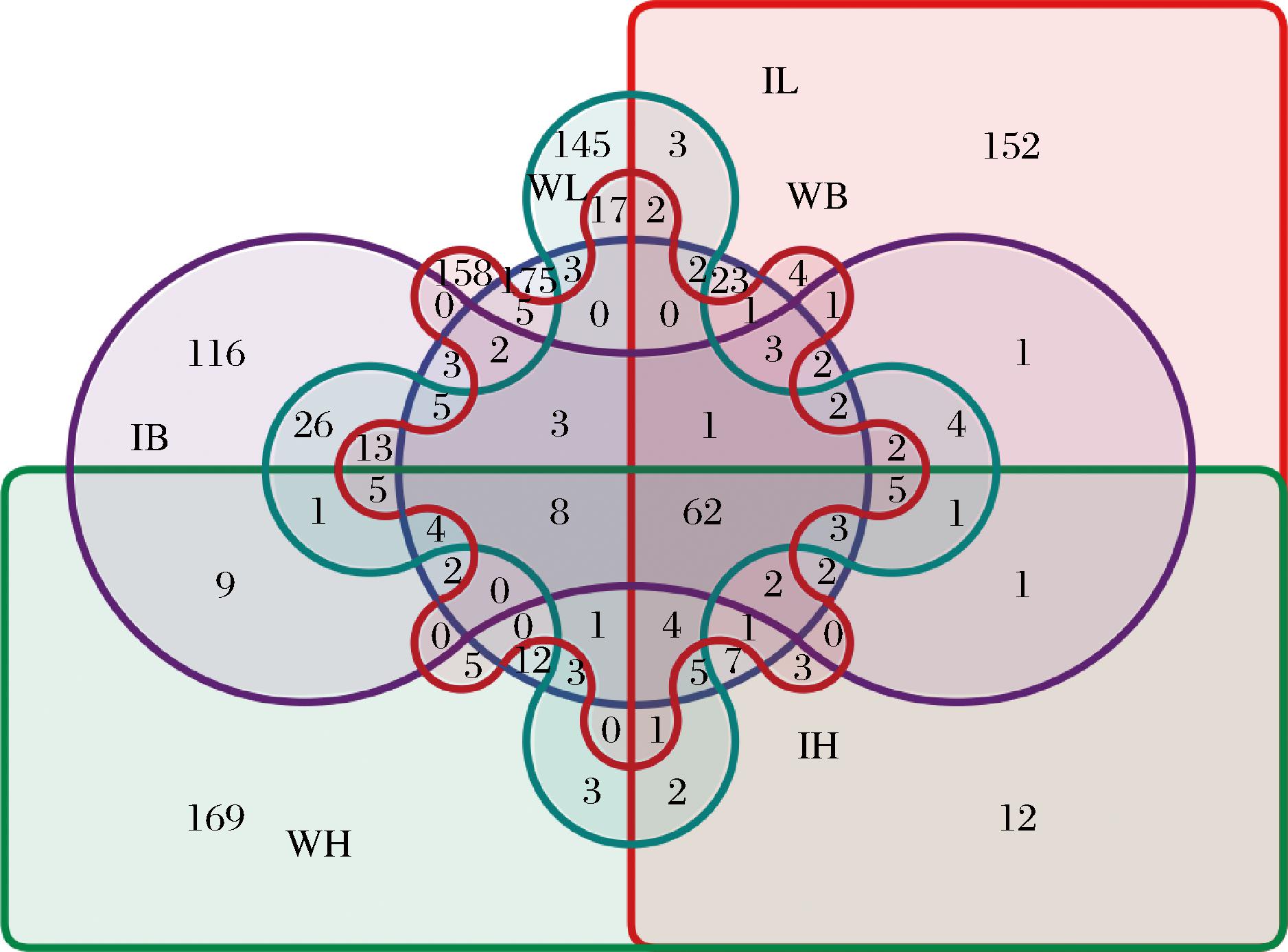 如图5所示,CIP的添加及体外消化处理均对菌群结构产生影响。6个处理组间共有62个操作分类单元(operational taxonomic units, OTUs),构成了样品的核心菌群。在未消化样品中,高剂量组(WH)特有OTUs 数量最多(169个),略高于空白组(WB,152个)和低剂量组(WL,145个),表明高浓度多糖在发酵阶段促进了部分菌株的选择性生长或代谢活化。经体外消化后,菌群结构明显重塑。低剂量组(IL)特有 OTUs数量显著增加(152个),明显高于消化对照组(IB,116个)与高剂量组(IH,12个),说明适量CIP在模拟胃肠环境下有助于维持群落多样性并促进新功能菌群形成。相反,高剂量消化组(IH)特有OTUs数量最少,提示过高多糖浓度可能增强选择性压力,导致特定菌群减少。综合来看,CIP的添加改变了肠道菌群OTUs的分布格局。低剂量处理可在维持核心菌群稳定的同时提升群落多样性和功能性,而高剂量添加则可能导致多样性下降与生态集中化效应。