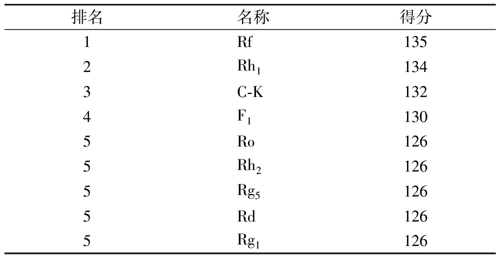 收集GSC-疲劳的共同靶点及其对应的人参皂苷成分信息,利用Cytoscape软件绘制出GSC-成分-靶点网络图,如附图2所示,GSC中人参皂苷成分与抗疲劳相关靶点关系密切。通过插件cytohubba筛选核心成分,如表2所示,获得评分前5的核心成分分别是人参皂苷Rf(ginsenoside Rf,Rf)、人参皂苷Rh1(ginsenoside Rh1,Rh1)、人参皂苷F1(ginsenoside F1,F1)、人参皂苷Rd(ginsenoside Rd,Rd)、Rh2、Rg1、Ro、C-K、Rg5。