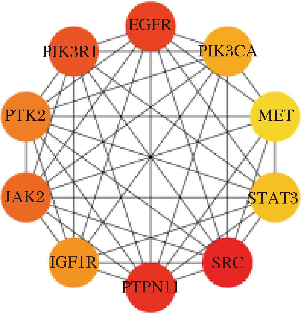 将GSC-疲劳的共同靶点导入到STRING数据库,得到共同靶点PPI网络图,如附图3所示。同时获得蛋白互作信息,得到182个靶点的454个互作信息,将信息导入至cytoscape软件进行分析。如图2、表3所示,筛选到评分前10的关键靶点为SRC、PTPN11、EGFR、PIK3R1、JAK2、PTK2、IGF1R、PIK3CA、STAT3、MET。