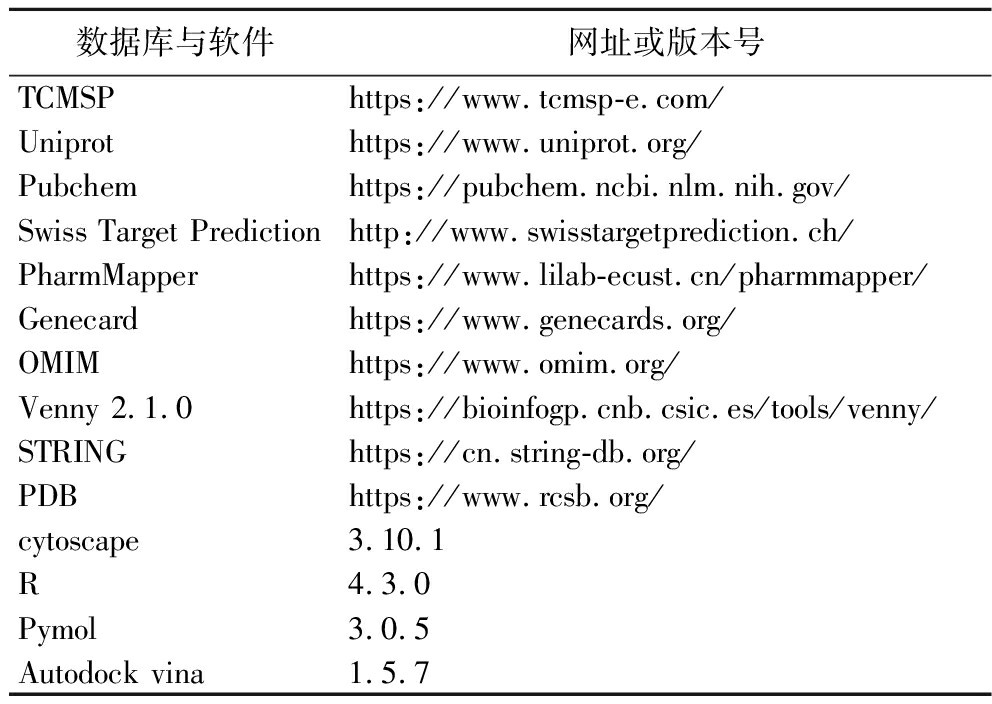 基于网络药理学及分子对接技术预测GSC抗疲劳机制时所使用的数据库及软件如表1所示。