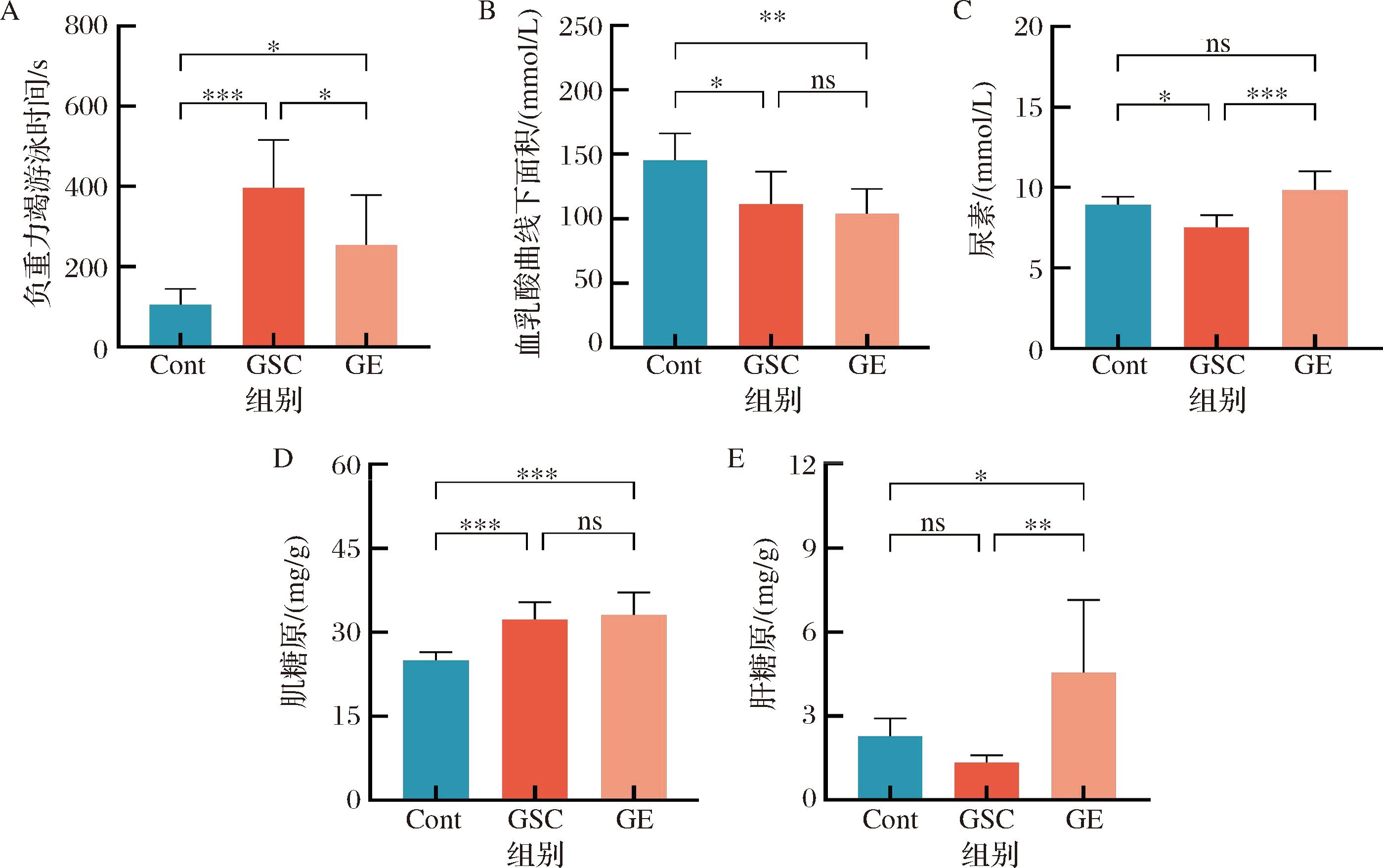 A-负重力竭游泳时间;B-血乳酸曲线下面积;C-尿素;D-肝糖原;E-肌糖原