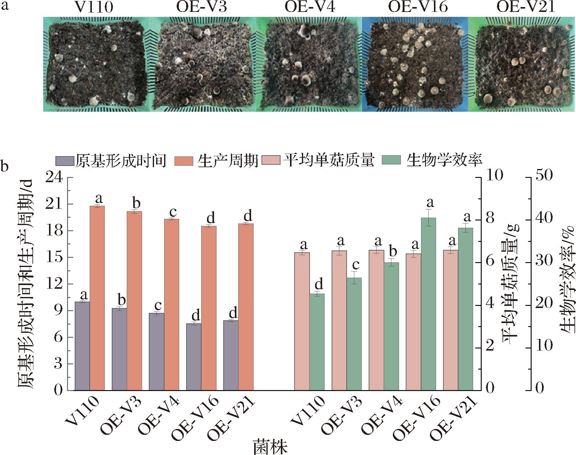 a-栽培实验;b-原基形成时间、平均单菇质量、生产周期和生物学效率