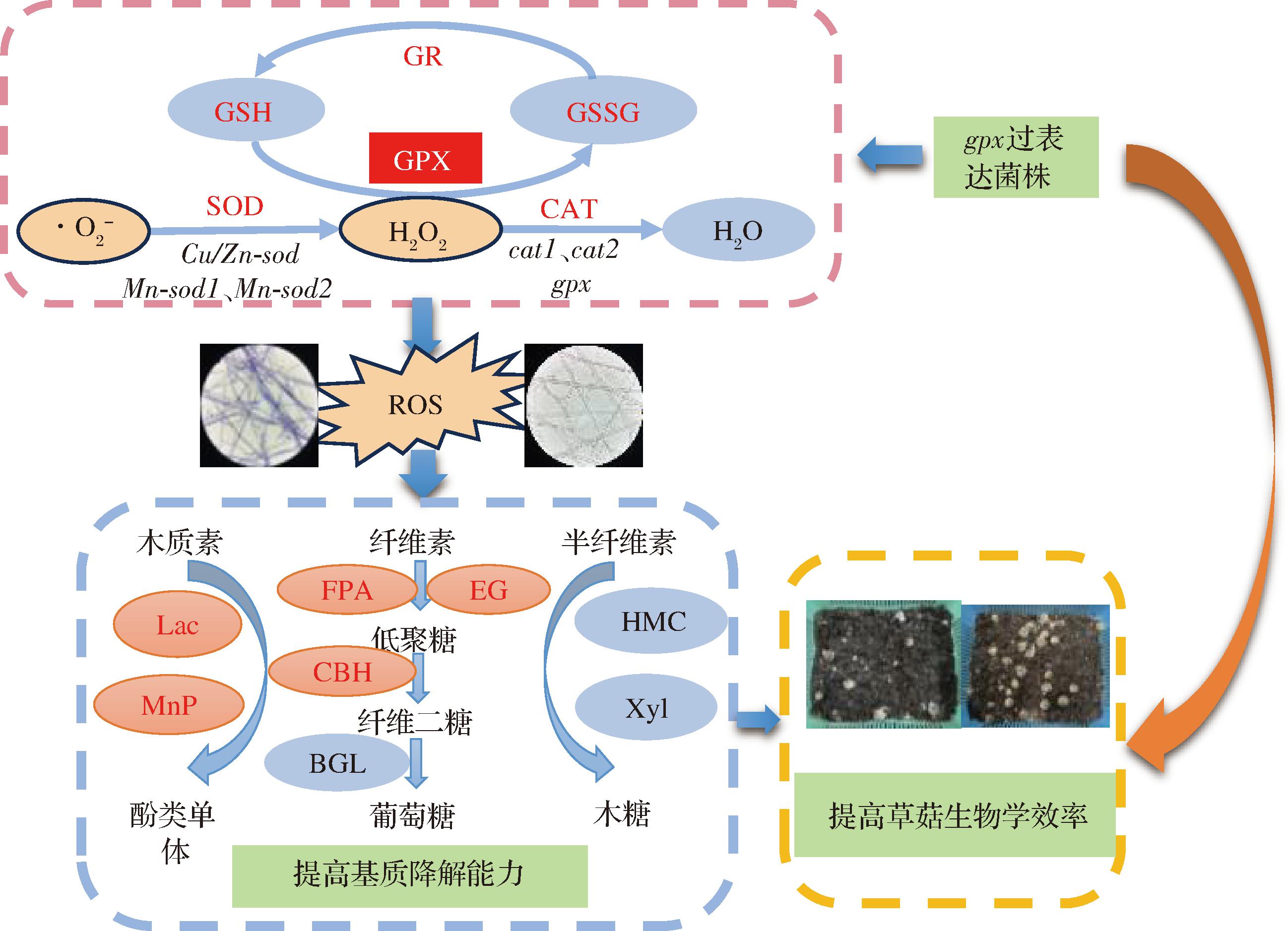 草菇是大规模人工栽培的食用菌,菌种质量直接关系到草菇的经济效益,因此草菇的遗传育种工作在产业发展中占据核心地位。在本研究中,gpx在草菇菌株中过表达后,相关抗氧化基因表达上调,抗氧化酶活性提高,ROS积累显著减少,菌丝抵御氧化胁迫的能力增强,部分基质降解酶活力升高;进而促进了草菇菌丝的生长,提高了草菇的生物学效率(图8)。本研究为草菇及其他食用菌在基因工程育种和提高生物学效率提供了一种新的策略。