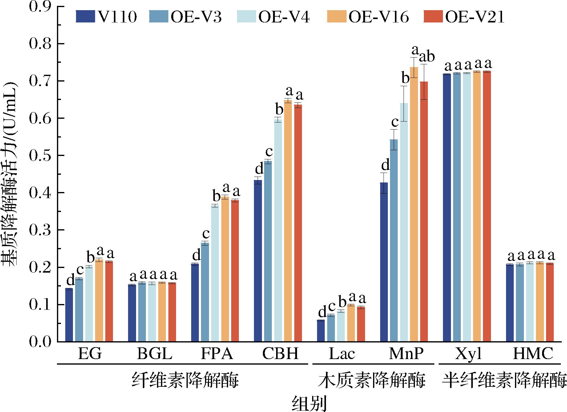 图4 草菇菌株的基质降解酶活力