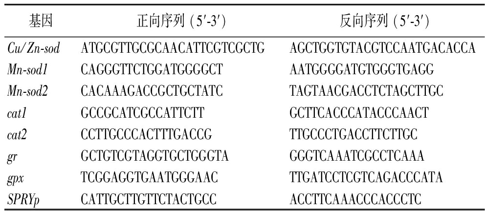 基因正向序列 (5′-3′)反向序列 (5′-3′)Cu/Zn-sodATGCGTTGCGCAACATTCGTCGCTGAGCTGGTGTACGTCCAATGACACCAMn-sod1CAGGGTTCTGGATGGGGCTAATGGGGATGTGGGTGAGGMn-sod2CACAAAGACCGCTGCTATCTAGTAACGACCTCTAGCTTGCcat1GCCGCATCGCCATTCTTGCTTCACCCATACCCAACTcat2CCTTGCCCACTTTGACCGTTGCCCTGACCTTCTTGCgrGCTGTCGTAGGTGCTGGGTAGGGTCAAATCGCCTCAAAgpxTCGGAGGTGAATGGGAACTTGATCCTCGTCAGACCCATASPRYpCATTGCTTGTTCTACTGCCACCTTCAAACCCACCCTC