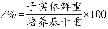 将草菇菌株统一活化后,接种于种子培养基上,30 ℃培养;当菌丝长满后,将其接种到装有栽培培养基的栽培框(40 cm×20 cm×10 cm)中,置于出菇箱中进行培养;待菌丝长满栽培培养基表面,喷出菇水,打开照明灯和加湿器,使温度保持在33 ℃,湿度保持在90%左右。在栽培过程中测定以下指标。