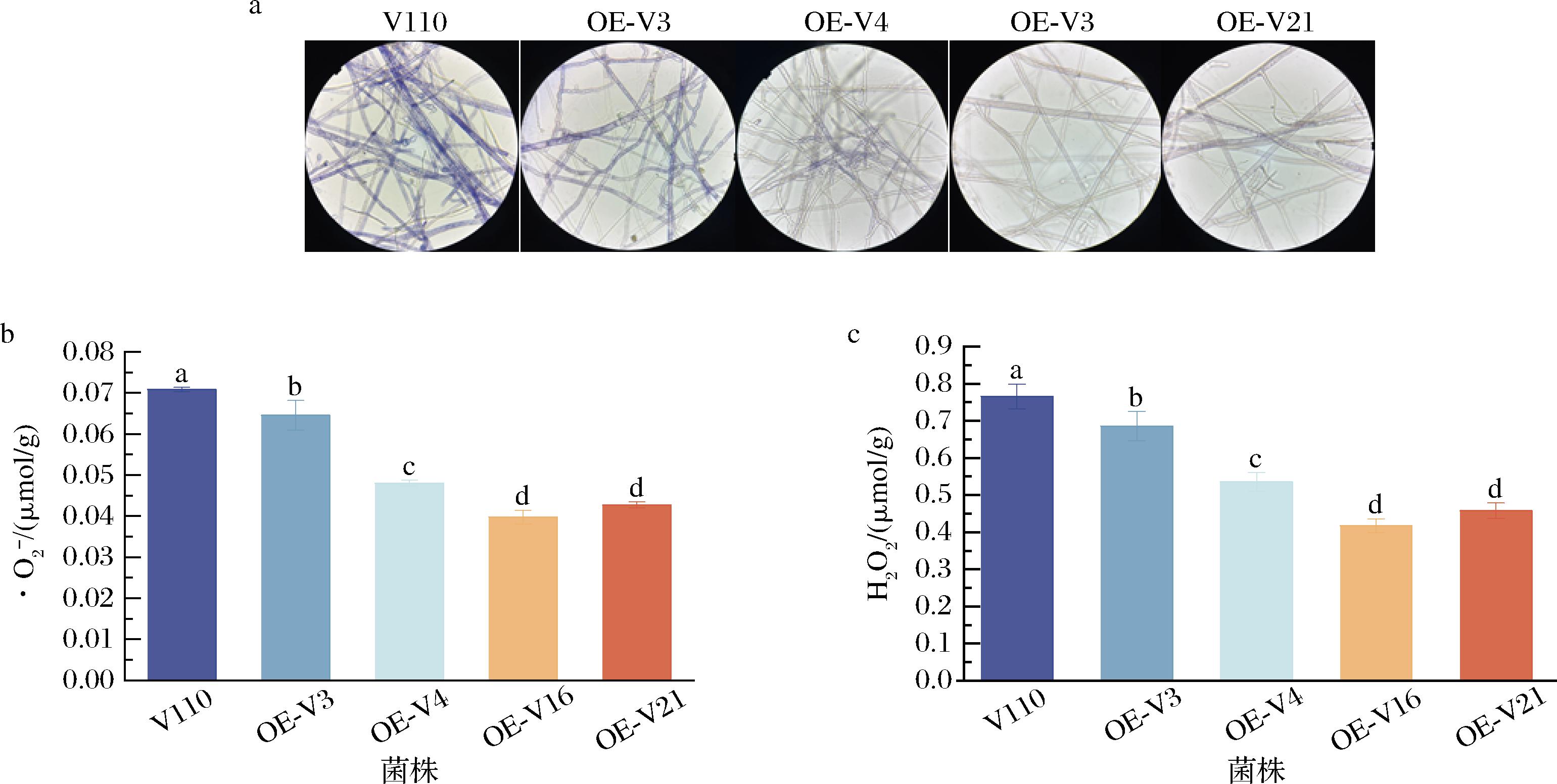 通过NBT染色实验测定草菇的ROS含量,颜色越深说明菌丝内ROS含量越高[19]。由图3-a可知,相同的染色时间内,V110的颜色呈现深蓝色,OE-V3、OE-V4呈现浅蓝色,OE-V16、OE-V21的菌丝颜色最浅,表明过表达gpx基因可以显著降低菌株的ROS积累。