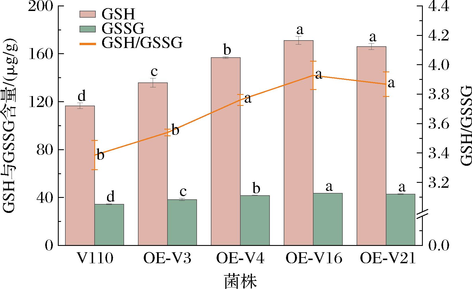 对草菇菌株的GSH和GSSG含量进行测定。结果如图2所示。4个过表达gpx基因草菇菌株的GSH、GSSG含量均显著高于V110(P<0.05)。OE-V16、OE-V21、OE-V4和OE-V3的GSH含量比V110分别升高了46.96%、42.55%、34.57%和16.69%;GSSG含量比V110分别升高了26.68%、24.76%、21.11%和11.59%。此外,OE-V4、OE-V16和OE-V21的GSH/GSSG值均较V110显著升高,OE-V16的GSH/GSSG值达到最高。这些结果表明,gpx基因相对表达量的提高可以提高草菇菌株中GSH和GSSG的含量。