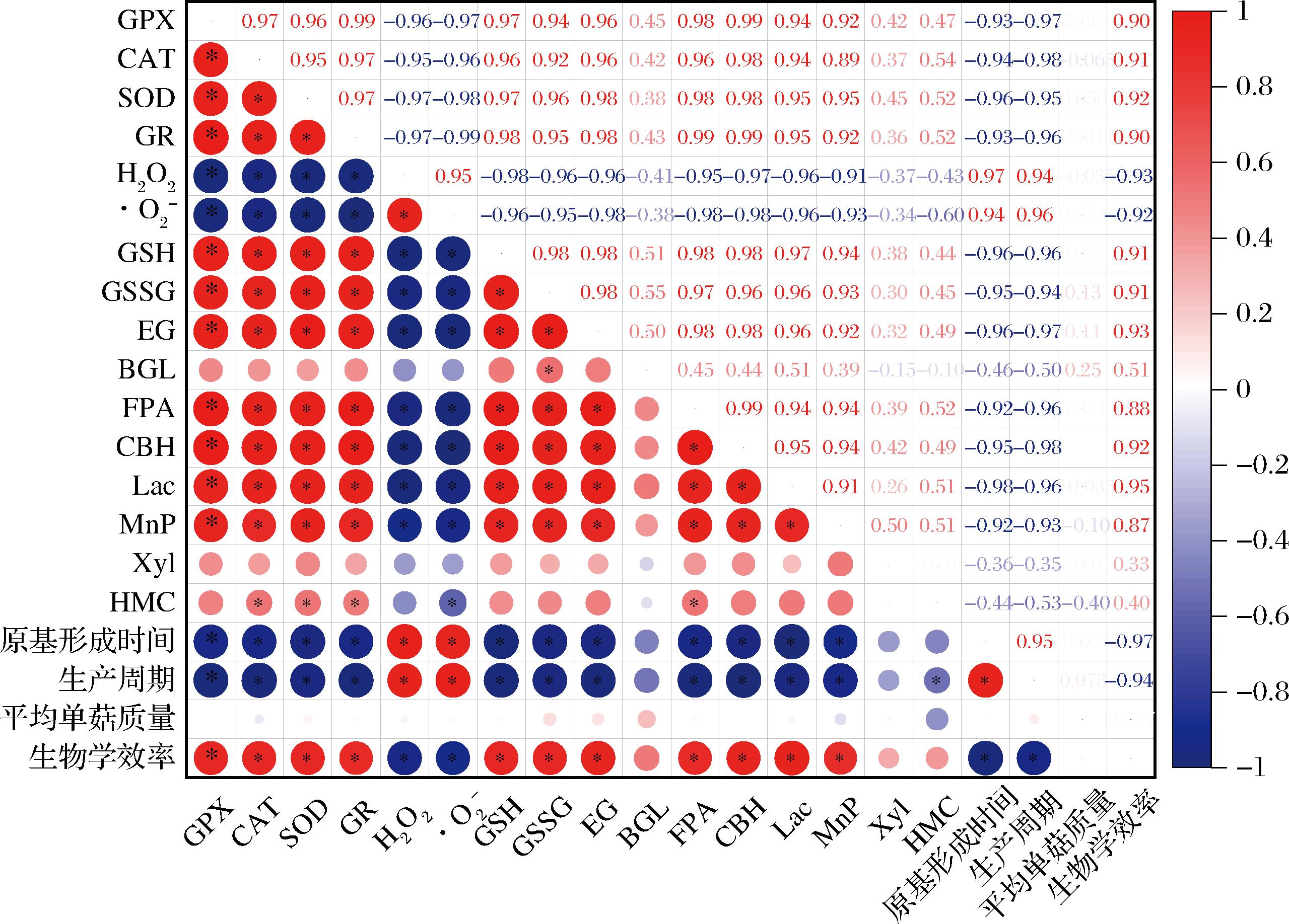 对草菇的ROS清除能力和生产性状相关指标进行相关性分析,结果如图7所示,GPX、CAT、SOD、GR的酶活力与GSH、GSSG含量及EG、FPA、CBH、Lac、MnP酶活力呈显著正相关,与