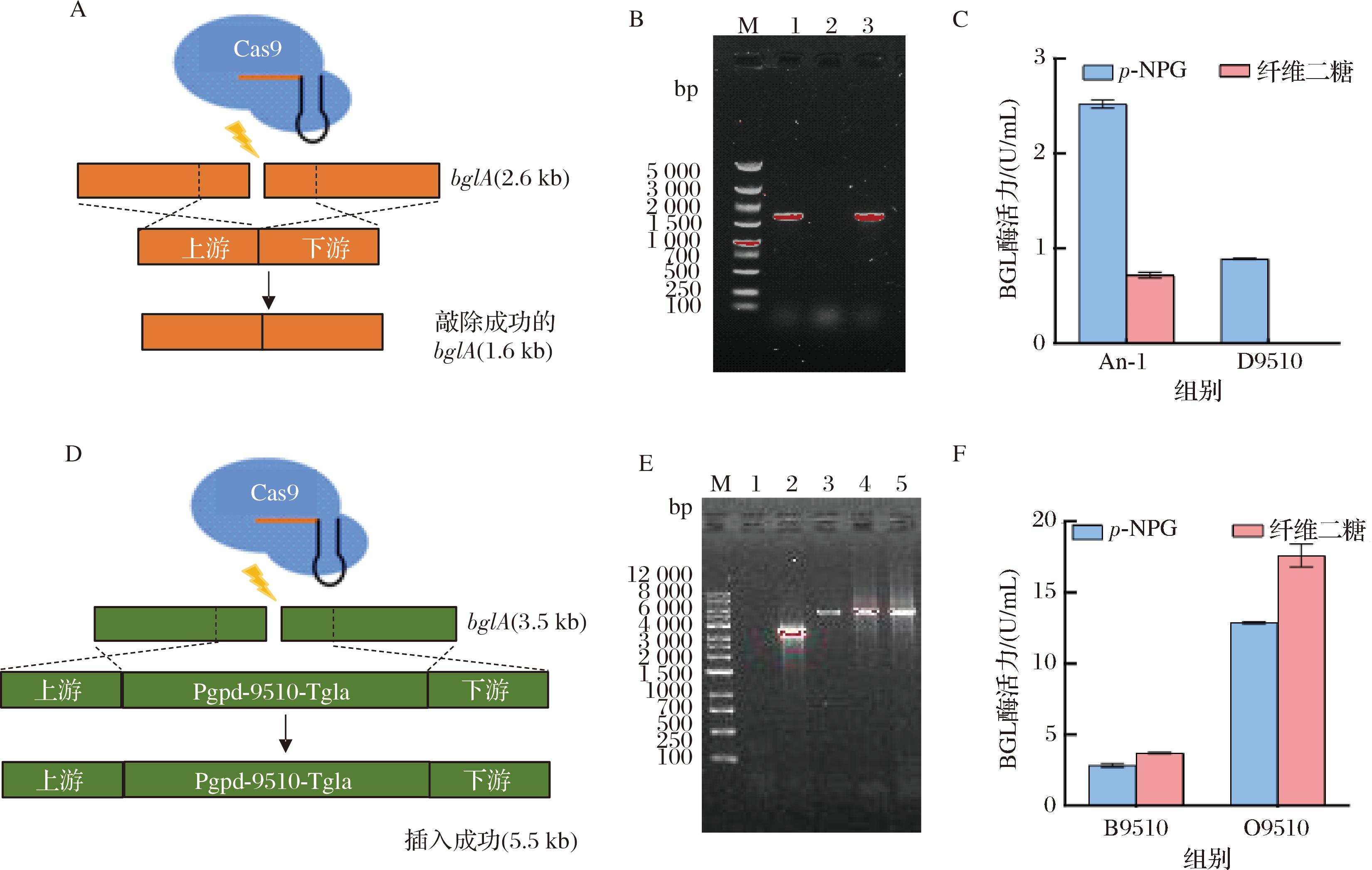 HQM9510基因通过鉴定,全长2 583 bp,蛋白分子质量为93.3 kDa,属于GH3家族。使用以上的CRISPR-Cas9基因组编辑技术,对HQM9510基因分别进行敲除和过表达(图8-A和图8-D),经转化子验证D9510与O9510构建成功(图8-B和图8-E)。酶活力比对发现,敲除菌株D9510的p-NPG酶活力出现明显下降,而纤维二糖酶活力几乎检测不到,而过表达菌株O9510的酶活力水平提升明显,以p-NPG与纤维二糖为底物的酶活力分别为12.88、17.10 U/mL,比游离表达菌株B9510酶活力分别提高4.2倍和4.4倍,由此确定了HQM9510为黑曲霉BGL关键基因,并得到过表达HQM9510基因的黑曲霉工程菌株O9510。