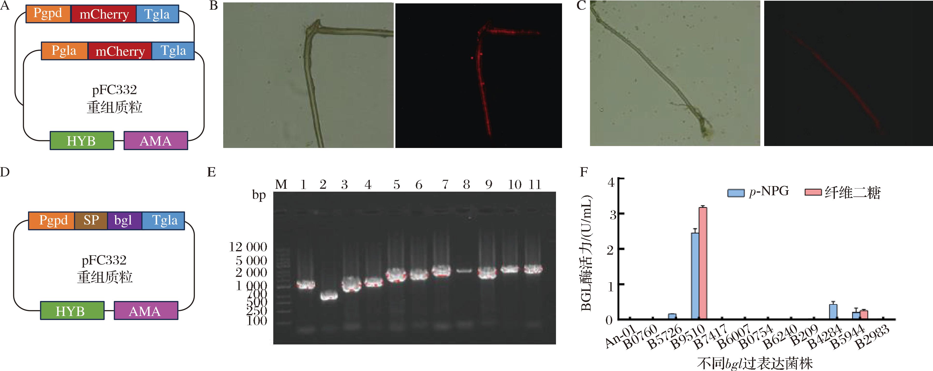 E图中泳道1~11为11条BGL编码基因,相关信息见表2。A-红色荧光蛋白表达盒子的构建;B-Pgpd-RED菌丝显微成像;C-Pgla-RED菌丝显微成像;D-不同BGL表达盒子的构建;E-不同BGL基因的凝胶电泳图;F-不同BGL表达菌株的酶活力测定